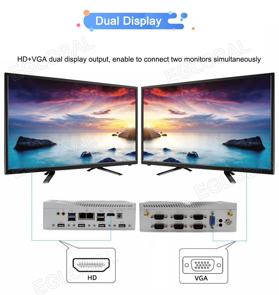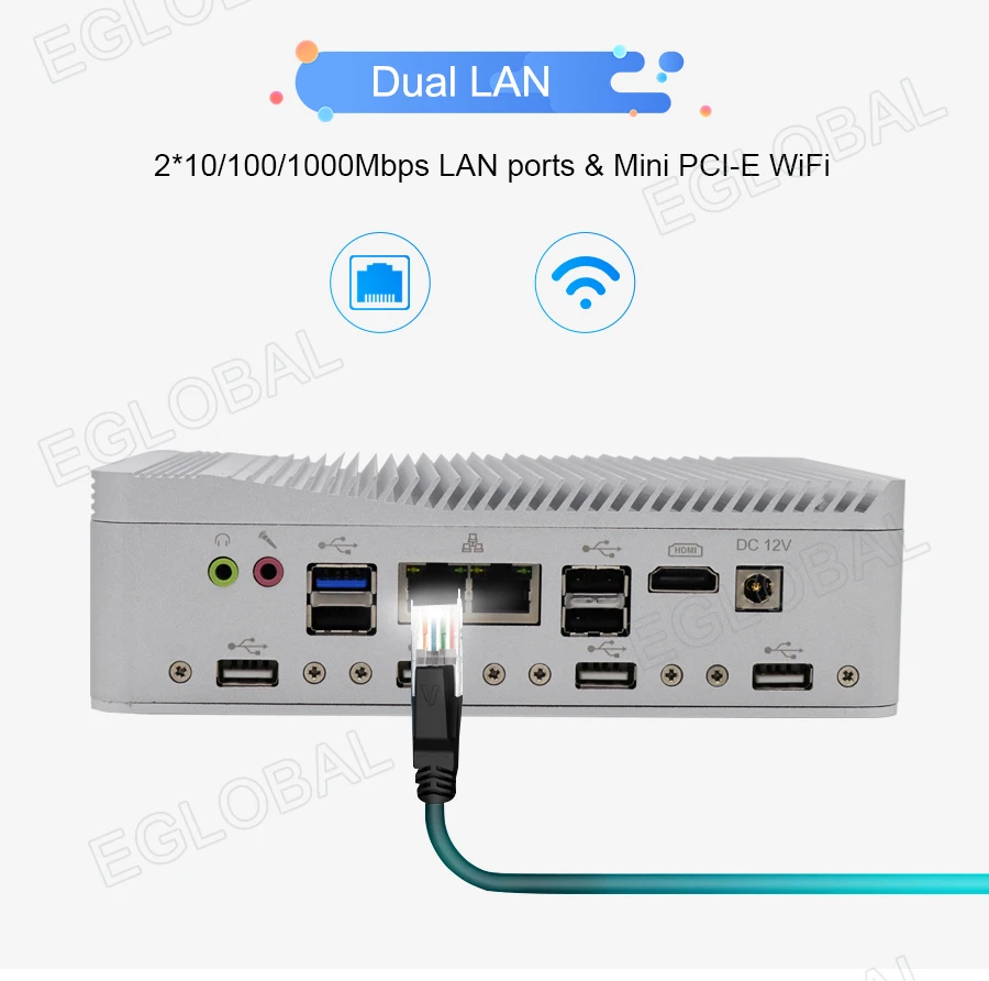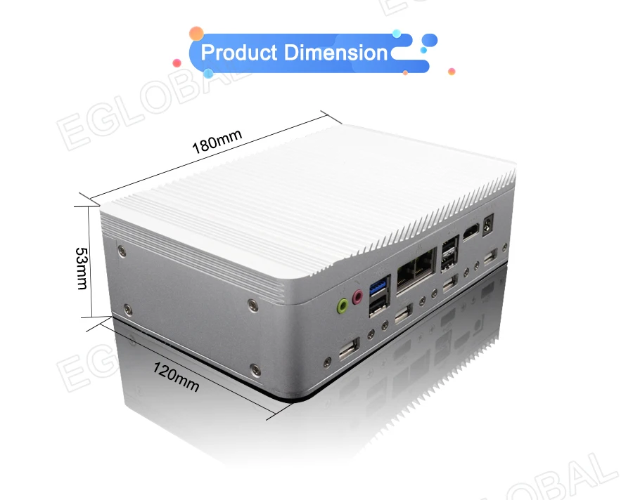 -2 Intel i211 Gigabit RJ45 LAN и 2 COM, можно изменить на RS232/RS422/RS485От BIOS. -Один встроенный разъем для micro SIM-карты для модуля 3G/4G. -Поддержка Watchdog, автоматическое включение, RTC, PXE boot, интерфейс State lamp,Триггерный переключатель (пластина 1*2). -Полностью алюминиевый сплав, серебристый корпус для теплоотвода, изысканное производствоИзготовлено по внешнему дизайну. -Безвентиляторная система без охлаждающего вентилятора, подходит для промышленного уровня, работает до тех пор, как24 часа в сутки. -Низкий расход TDP только 10 Вт и может быть установлен на стене. -Синхронно поддерживает двойной дисплей VGA + HDMI. Технические характеристики:|