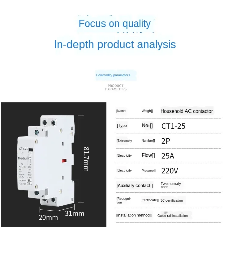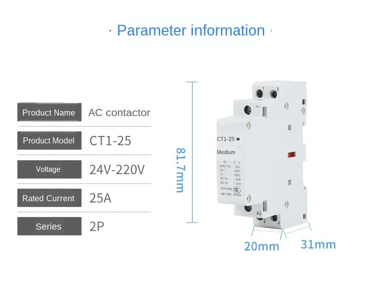 CT1 house hold AC contactor is mainly designed for AC 50Hz or 60Hz circuits with 230V . Rated operating voltage in AC-7a usage ,rated operating voltage up to 230V, rated operating current up to 25A, Rated operating voltage in AC-7b usage , rated current to 10A. Using in breaking capacity below 6kA circuit. For distance connect or break the circuit.