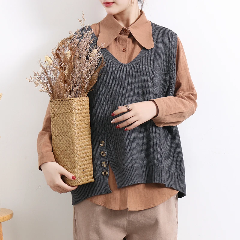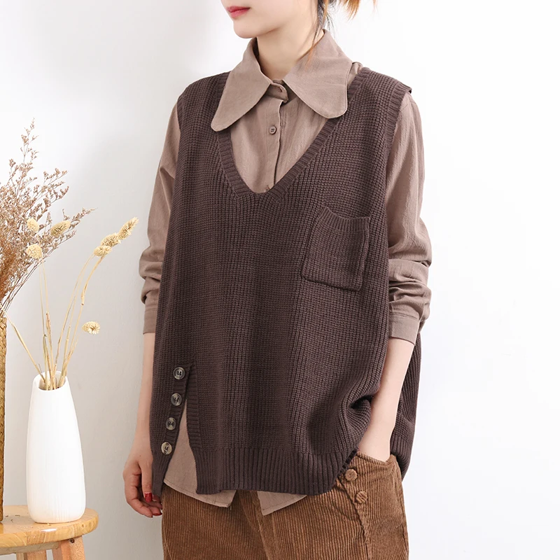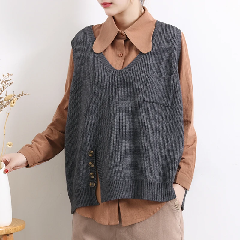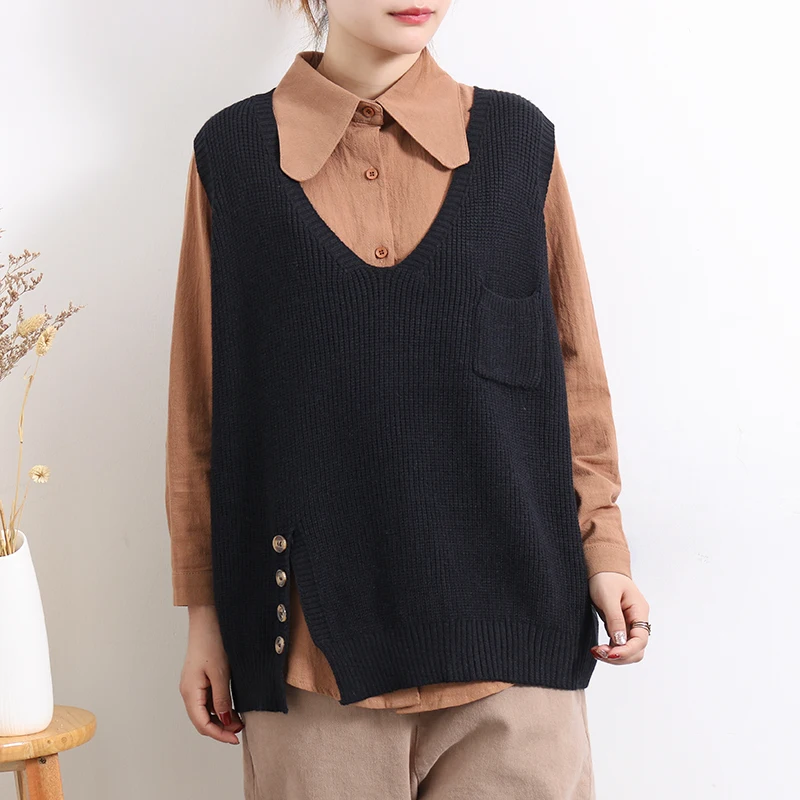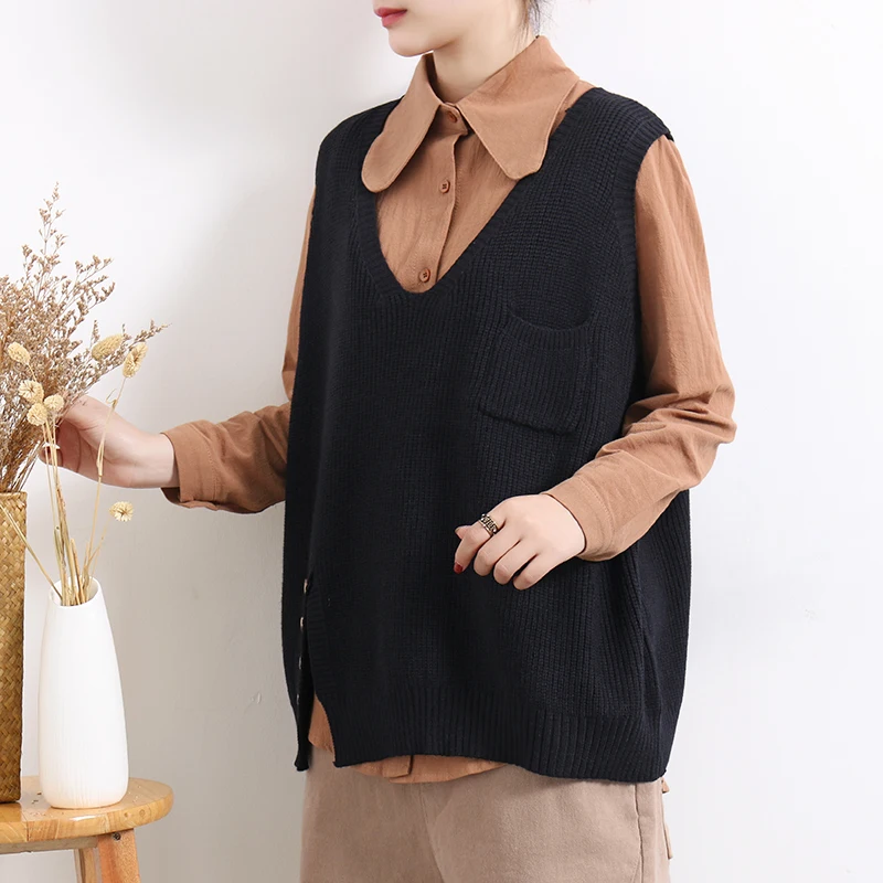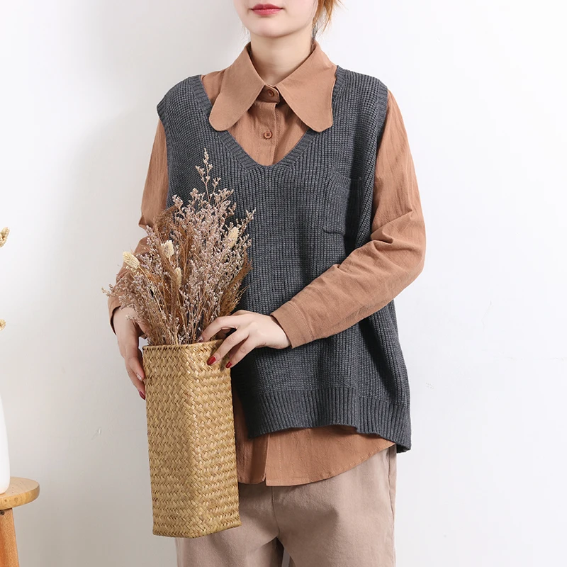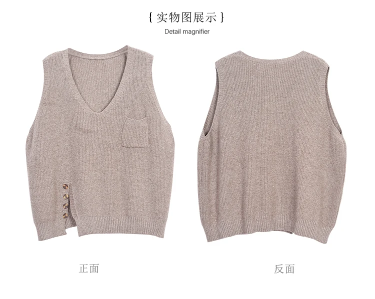 Женский свитер без рукавов, весенне-осенний свободный Однотонный пуловер с v-образным вырезом и карманами, 2020