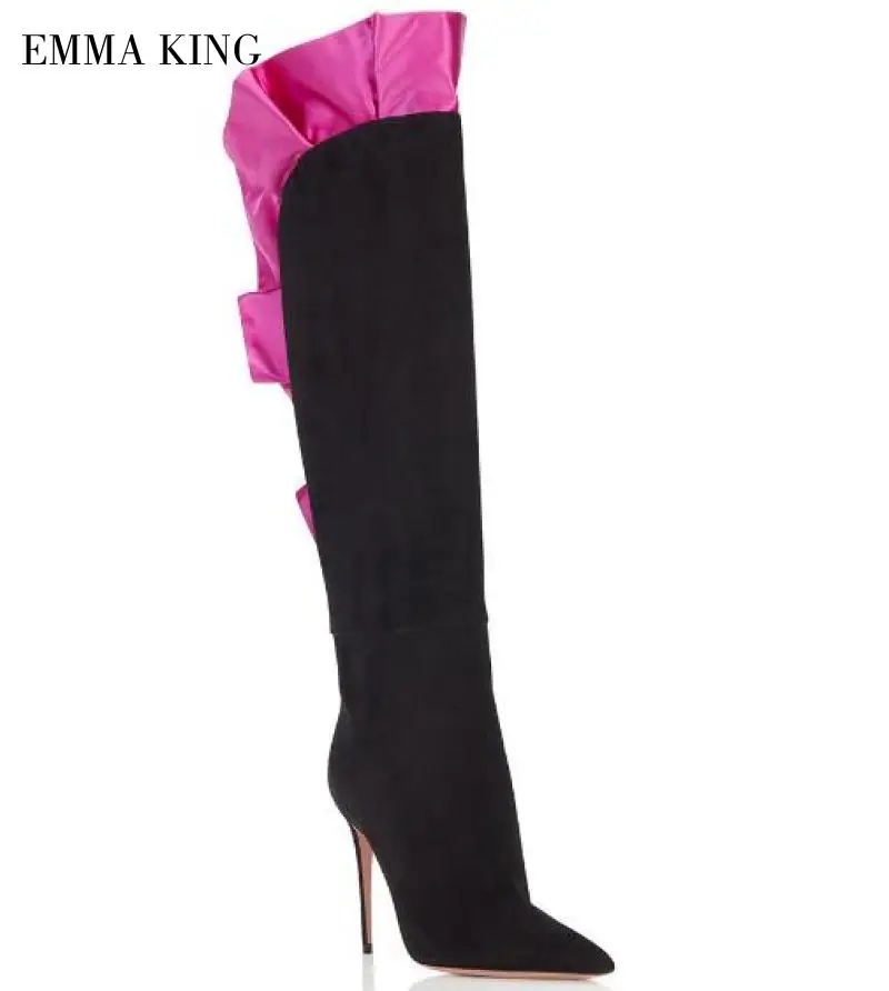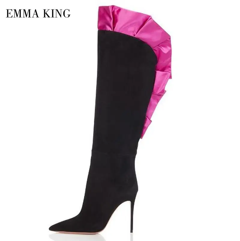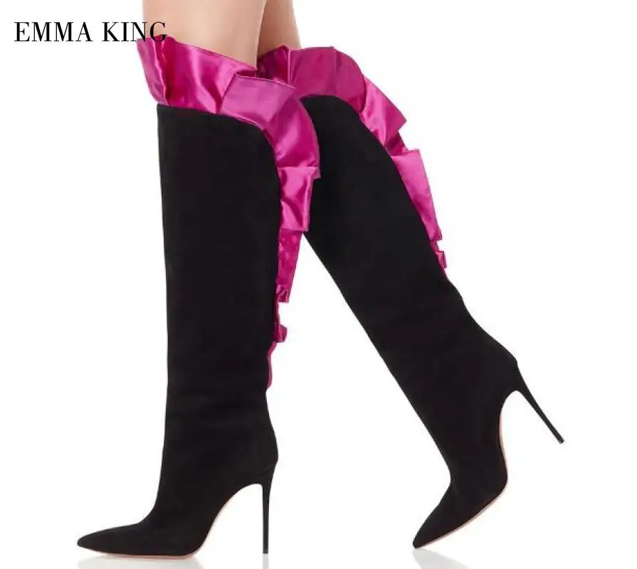 Женские замшевые сапоги до колена; Цвет розовый, черный; Высокие сапоги в стиле пэчворк с оборками; Женские сапоги на шпильке без застежки; Сезон осень-зима