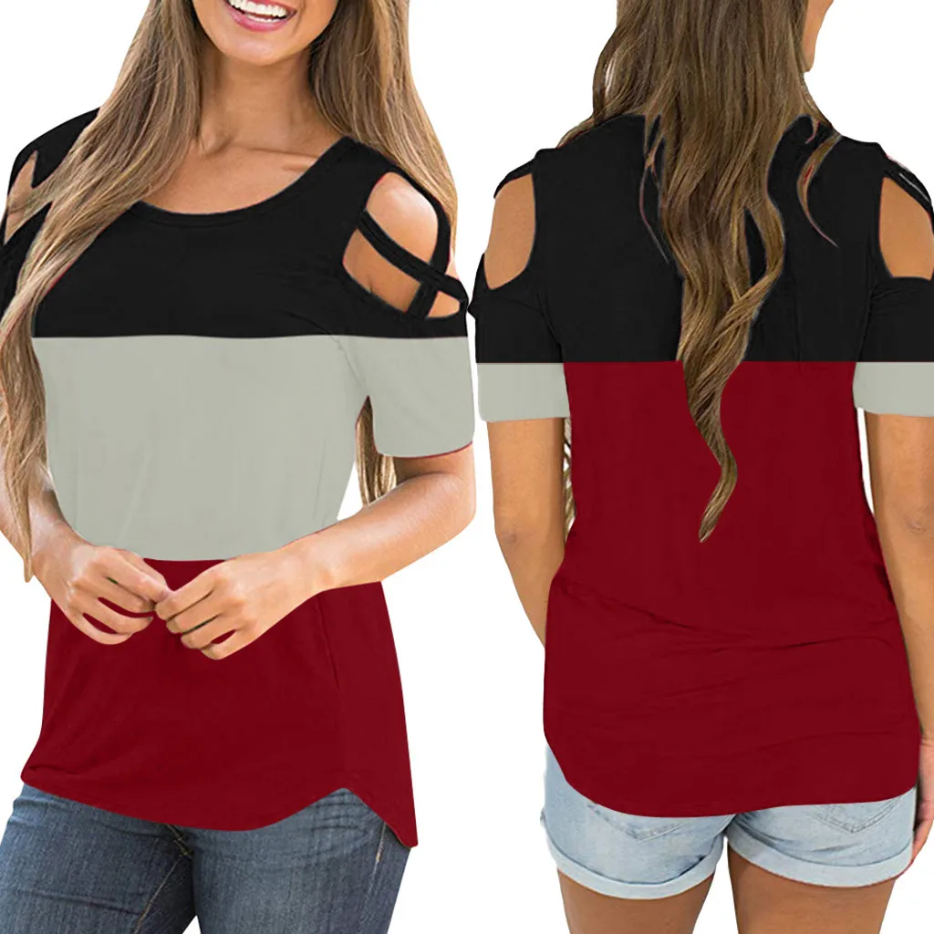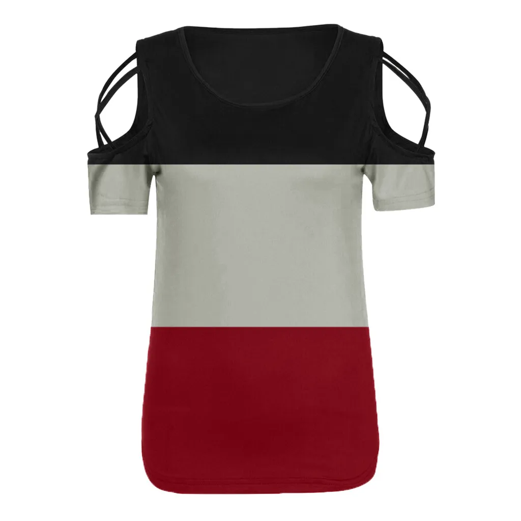 Женская летняя футболка с коротким рукавом, с цветными блоками, с лямками, с открытыми плечами, топы, блузки
