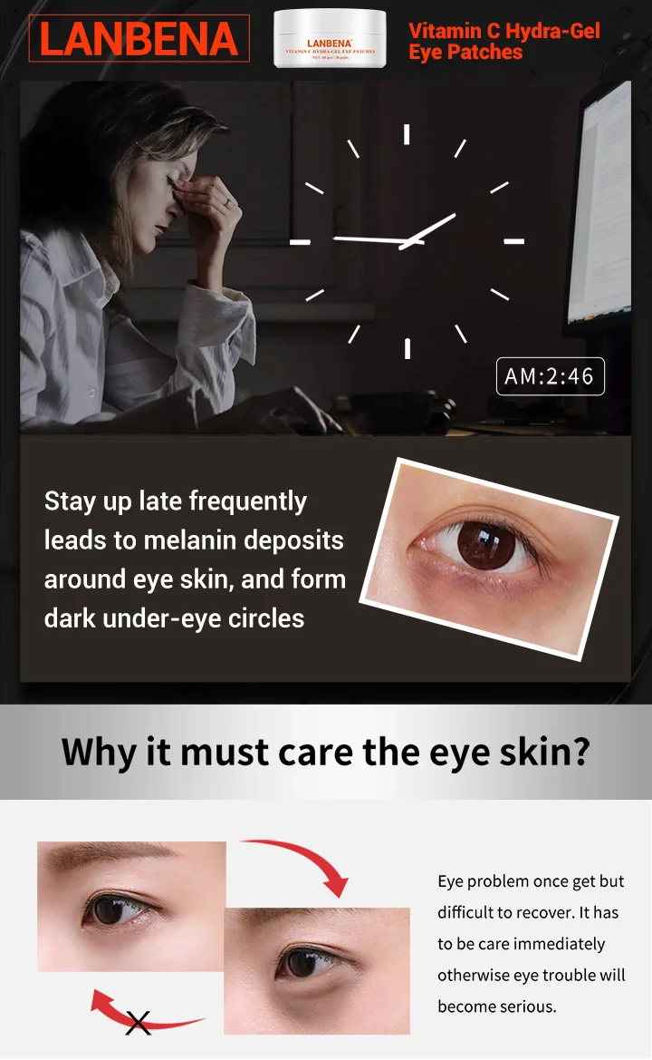 Увлажняющие патчи для глаз с витамином С Оставайтесь на ипподром, часто приводя к отложениям меланина вокруг кожи вокруг глаз и формируя темные круги под глазами Почему он должен ухаживать за кожей вокруг глаз? Когда-то возникает проблема с глазами, но трудно восстанавливать. Это должно быть уход сразу же, в противном случае, проблемы с глазами будут тяжелыми.