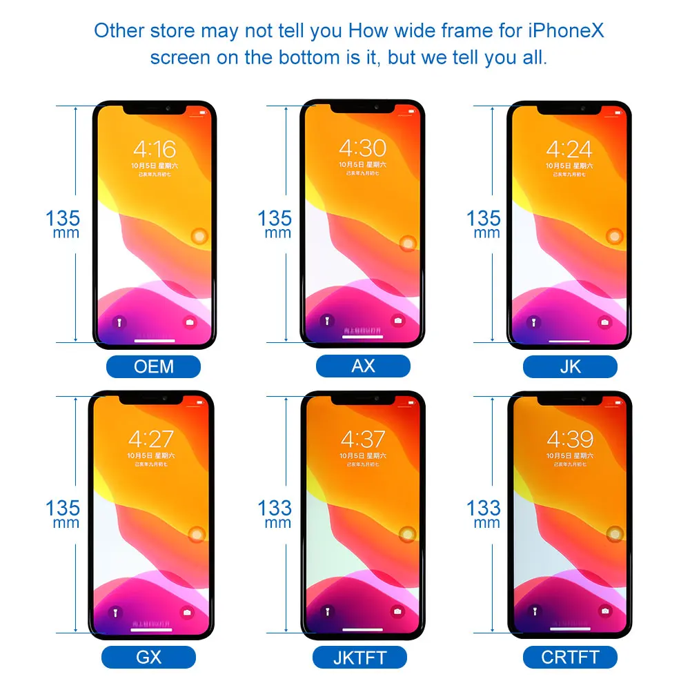 1. Детали: внешнее стекло + ЖК-экран + сенсорная панель дигитайзера + кольцо фронтальной камеры + кольцо светильник вого датчика + Пылезащитная сетка Earspesker, предварительно собранная. 2. Подходит: для iPhone X/XS 3. Контроль качества: Каждый экран проверяется перед отправкой и работает на 100%. 4 посылка: поставляется с антистатическим пакетом + пузырчатый пакет, безопасная упаковка. 5. Гарантия: Мы предоставляем гарантию на 6 месяцев (гарантия аннулирована, если ЖК-дисплей/гибкий кабель/рамка повреждена после установки или во время установки).