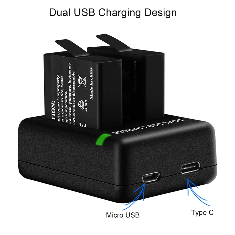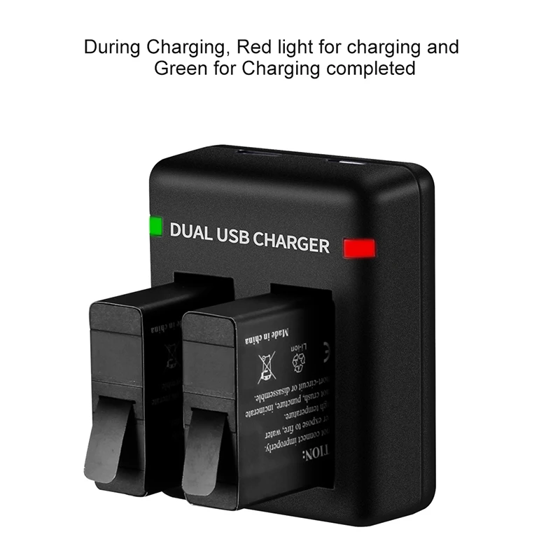 Зарядное устройство с двумя аккумуляторами для GoPro Hero 8, 7, 6, 5, черного цвета Особенности: 1. Это зарядное устройство предназначено только для батарей GoPro Hero 8, 7, 6, 5, совместимых с ними, и совместимых с ними батарей, которые входят в комплект, и совместимы с батареями GoPro Hero 8, 7, 6, 5, 1. 2. Может заряжать три/две батареи одновременно 3. С автоматическим контролем постоянного тока предотвращает повреждение батареи от перезарядки 4. Высокая эффективность преобразования энергии, конструкция защитной цепи 5. Защита от перезарядки, защита от перегрузки, защита от недостатка 6. Безопасная и надежная, идеально подходит для путешествий и активного отдыха 7. Совместим с: Черной Камерой GoPro Hero 8, 7, 6, 5, с: AHDBT-501 Описание: Укажите красный цвет, когда аккумулятор заряжается; Укажите зеленый цвет, когда завершите зарядку. Совместима с моделями аккумуляторов: Go Pro, AHDBT-501 Совместим с цифровыми моделями: Go Pro HD Hero 8 7 6 5 Black.