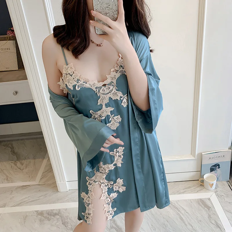 Весенний женский атласный шелковый халат и платье наборы Сексуальная кружевная