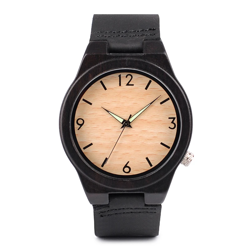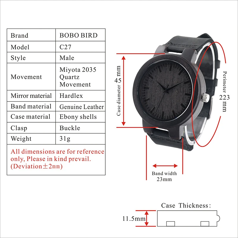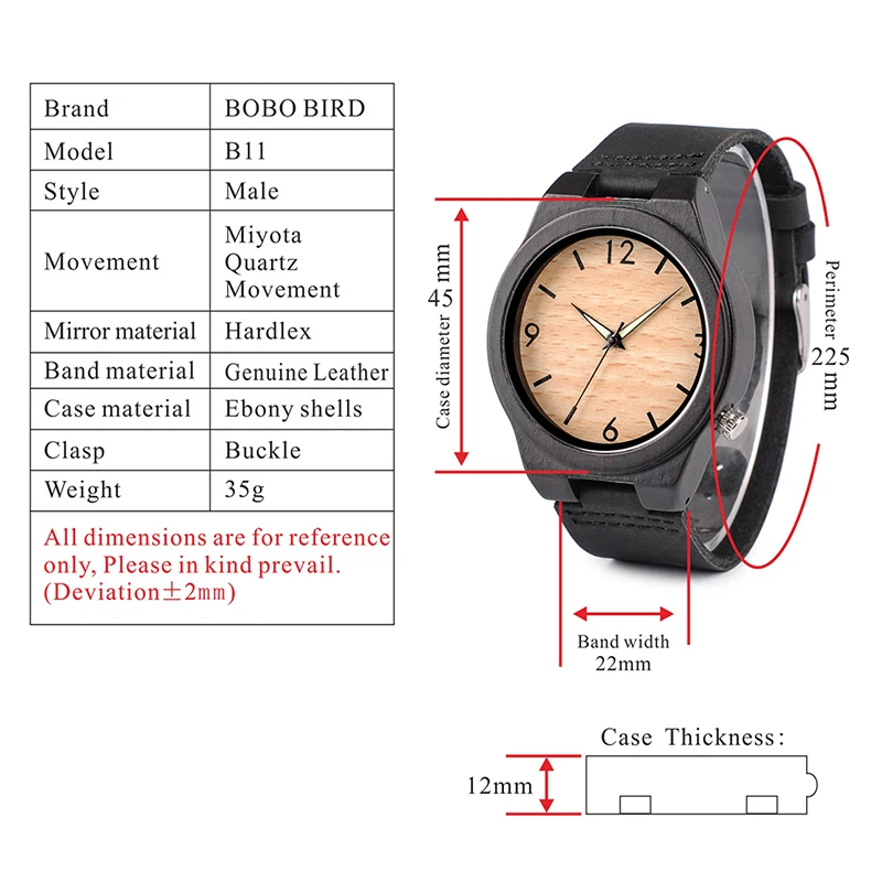 Оригинальные часы BOBO BIRD Чехол тщательно изготовлен из 100% деревянного каркаса Параметры Чехол: диаметр 45 мм Циферблат: Круглый циферблат Механизм: кварцевый механизм Miyota 2035 Материал ремешка: кожа/черное дерево 3 АТМ Водонепроницаемость (вы можете использовать его во время дождя и мытья рук, не поддерживает горячую воду и плавание) Срок гарантии: 1 год Посылка: 1 * деревянные часы BOBOBIRD 1 * Подарочная коробка для часов 1 * инструменты для часов