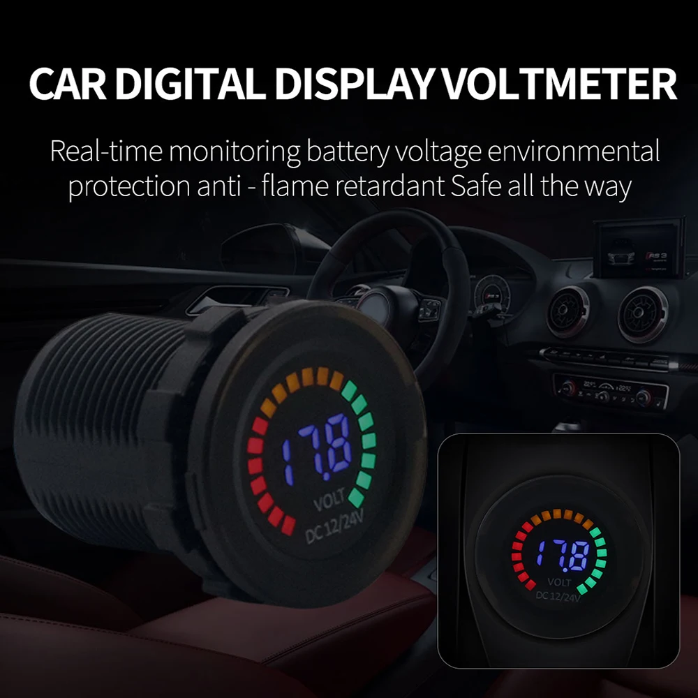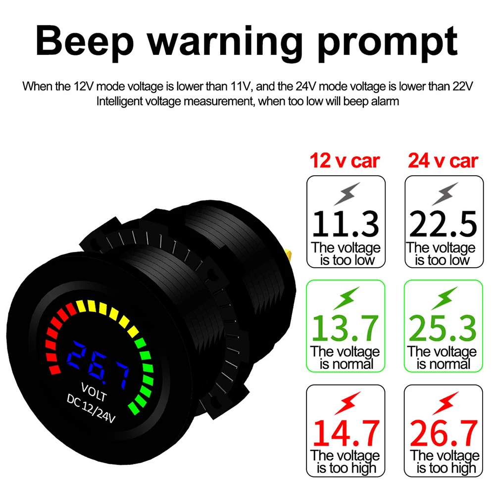 Особенности: Легко определить статус заряда батареи светодиодный 12 / 24V система автоматического обнаружения (совместим с двумя различными системами) 3 светодиодный панель с цифровым дисплеем, для чтения за считанные секунды, более интуитивно понятный, быстрый и удобный. Мини-размер, легко носить с собой, экономит место и не мешает вождению, гарантирует безопасное вождение. Легко устанавливается с помощью необходимых фитингов, удерживает счетчик на месте, фиксирует плотно и не легко перемещается, отлично подходит для проверки напряжения. Изготовлен из высококачественного материала, огнестойкого и экологически безопасного, безопасного и долговечного.
