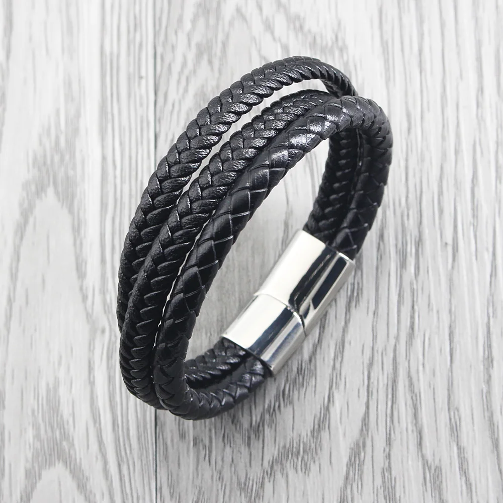 Материал: кожа и нержавеющая сталь 316L Внутренний периметр браслета: 19 см/21 см/23 см Цвет кожи: черный Цвет застежки: серебристый/золотой/черный 1. Плетеная натуральная кожа: Смешанная Плетеная кожа, очень прочная 2. Застежка из нержавеющей стали: Твердая магнитная пряжка из нержавеющей стали 316L, полированная