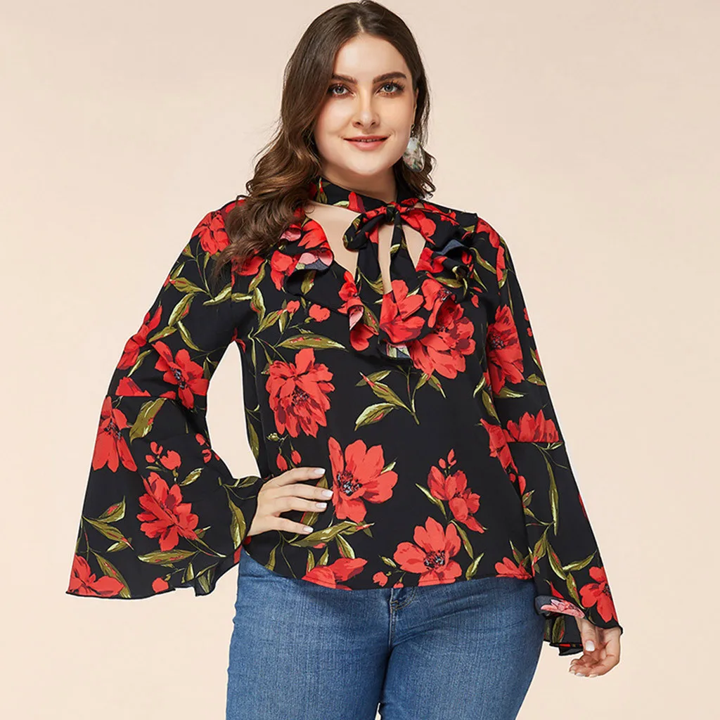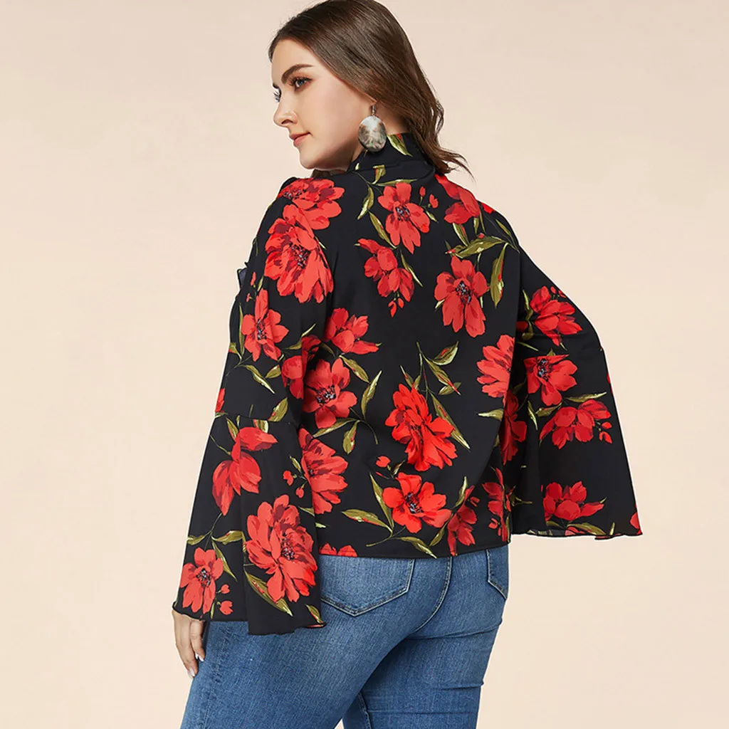Женская блузка с рукавом-трубой и цветочным принтом, рубашка большого размера