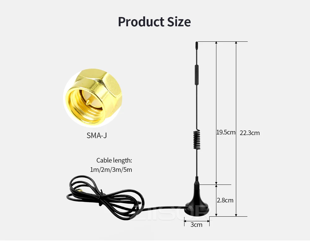 О нас: Chengdu Ziisor Technology Co., Ltd. Мы технологическая компания, которая специализируется на R & D и производстве антенн. У нас есть профессиональная R & D команда и техническая сила. Наши антенны обладают надежным качеством и производительностью. Если у вас возникли проблемы с использованием антенны или вам нужна Спецификация антенны, вы можете связаться с нами в любое время: Поддержка @ ziisor.com Материал: углеродистая сталь + АБС-пластик Материал радиатора: медь Тип разъема: SMA-J Цвет: черный Высота антенны: 223 мм Диаметр присоски: 30 мм Длина кабеля: 1 м/2 м/3 м/5 м Материал кабеля: RG174 Частота: 230 МГц Максимальное усиление: 3,5 дБи (фактические данные тестирования) Тип излучения: всенаправленный Поляризация: вертикальная Номинальное сопротивление: 50 Ом Максимальная входная мощность: 50 Вт S.W.R. : ≤ 2 Применение: беспроводной модуль 230 МГц/роутер/усиление сигнала Wi-Fi