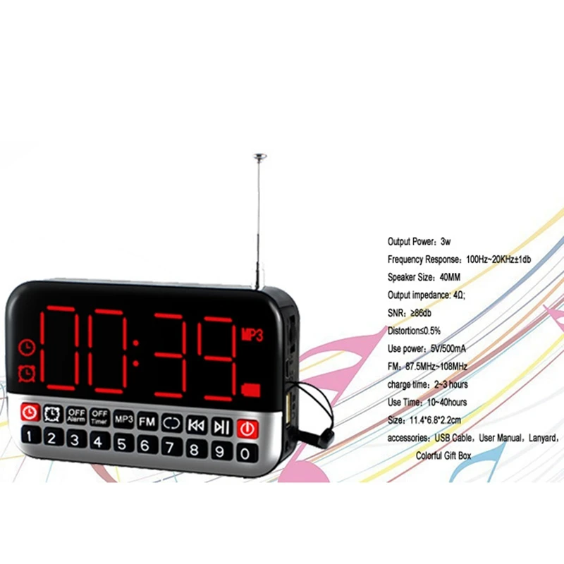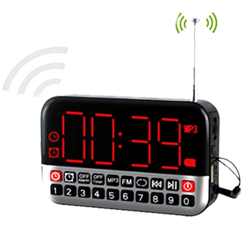 In case of low power, the time setting is saved for 200 days, and the time setting is solved once;Imported speakers, high quality sound quality, high power output, loud sound;Large silicone button, digital songs to select the audio segment, comfortable and convenient to operate;One-button clock/radio/music function;Support fast forward and rewind