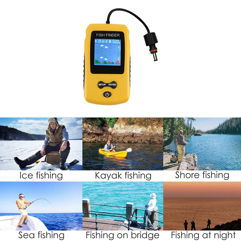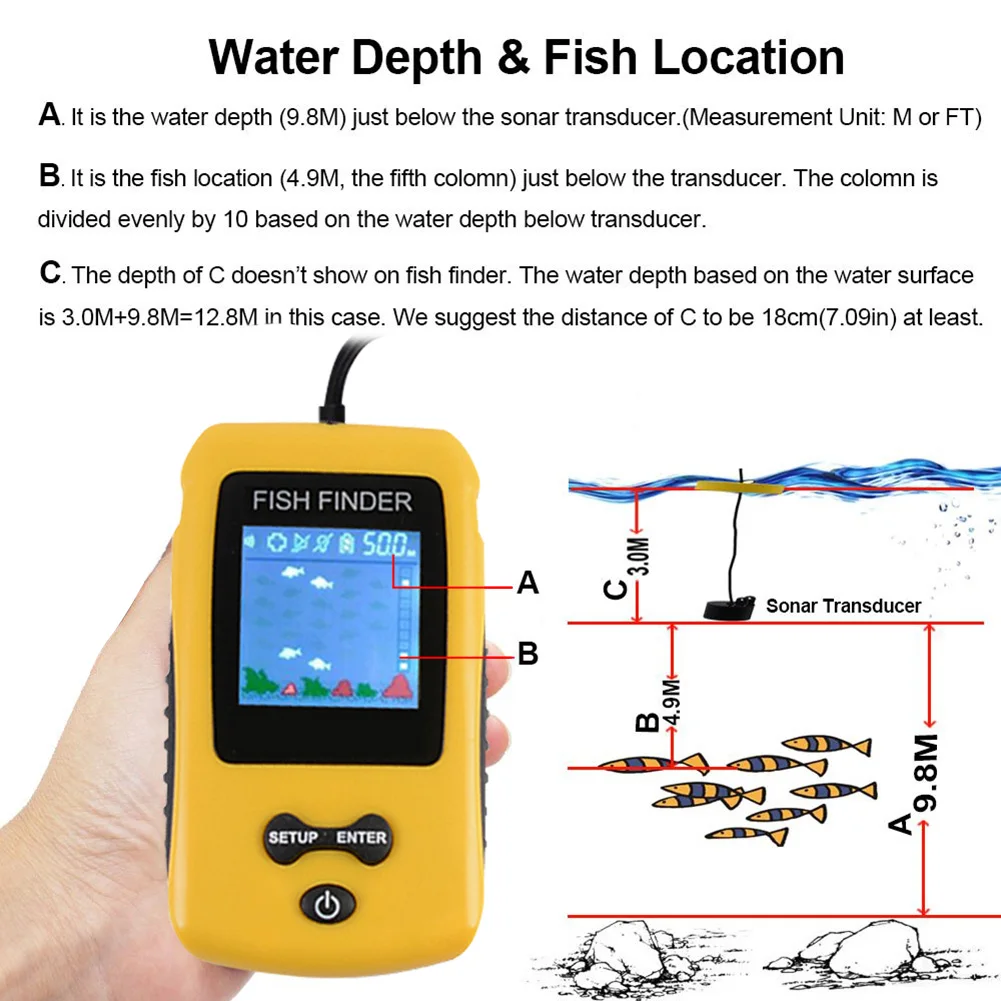 Параметры: 1. Единицы измерения: метров/футов 2. Дисплей: ЖК-дисплей 3. Освещение: светодиодный 4. 4,6 см диаметр круглый датчик 5. Диапазон глубины: Макс: 100 м (328ft); мин: 0,9 м (3ft) 6. Угол луча датчика: 45 градусов 7. Отображение природы или обстоятельств морского дна (т. Е. Травы, скалы и песка) 8. Рабочая температура от-10 °C до 45 °C (14 °F до 113 °F) 9. Используются 4 батарейки AAA (не входят в комплект) Особенности: 【Рыбок и нижний контур индикации: рыболокатор портативный обнаруживает и отображает глубину воды, приблизительное расположение рыбы, короткие и высокие сорняки, песок и камни на дне. Эхолот портативный дизайн дает вам еще один вариант, чтобы повесить его на шею. 【Рыболокаторы для КАЯКОВ подходят для различных рыбок, рыболовных условий: он используется для рыбалки на суше, Рыбалки На Байдарках, подледной рыбалки, рыбалки на озере, морской рыбалки и так далее. Вы также можете использовать ручной рыболокатор на движущемся каяке со скоростью менее 5 км/ч. ◆Индикация глубины: портативный детектор рыболокатора находится в 45 ° конус под водой. Дальность обнаружения составляет от 3 футов (1 м) до 328 футов (100 м) ниже датчика рыболовного гидролокатора. Глубина воды может быть показана в футах или метрах. Датчик гидролокатора с кабелем 25 футов и съемным датчиком поплавка. ④ Маленький портативный эхолот с мощными функциями: 5 режимов чувствительности; режим экономии батареи; режим подсветки; Сигнализация для школы рыбы и рыбы. Обычно Искатель глубины рыбалки поддерживает 4-5 часов непрерывной работы с совершенно новыми батареями. Режим сохранения открытой батареи может работать еще дольше.