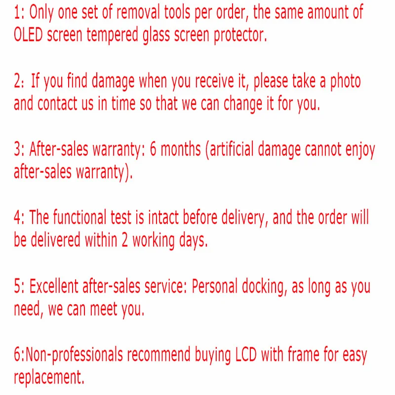 1: каждый заказ предоставляет только один набор инструментов для разборки, такое же количество протекторов для ЖК-экрана из закаленного стекла. 2: после получения, он был поврежден, пожалуйста, сделайте снимок и свяжитесь с нами вовремя, чтобы мы могли изменить его для вас. 3: гарантия после продажи: 6 месяцев (ущерб, причиненный человеком, не может быть получен после продажи). 4: функциональная проверка не повреждена перед поставкой, и заказ будет доставлен в течение 2 рабочих дней. 5: отличное послепродажное обслуживание: мы можем удовлетворить вас до тех пор, пока вам это нужно. 6: непрофессионалы рекомендуют покупать ЖК-экраны с границами для удобной замены.
