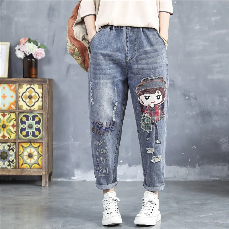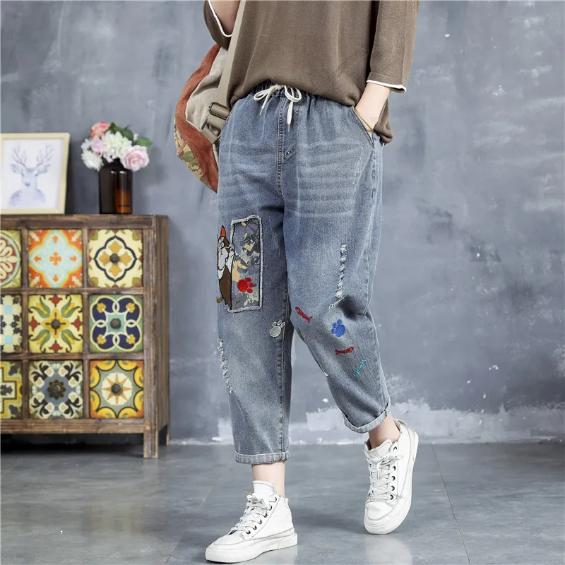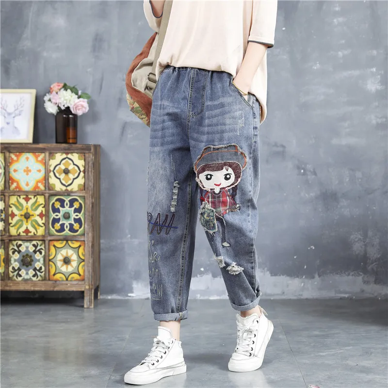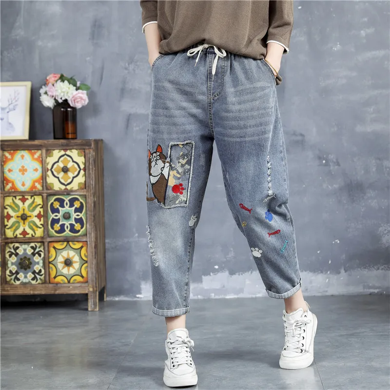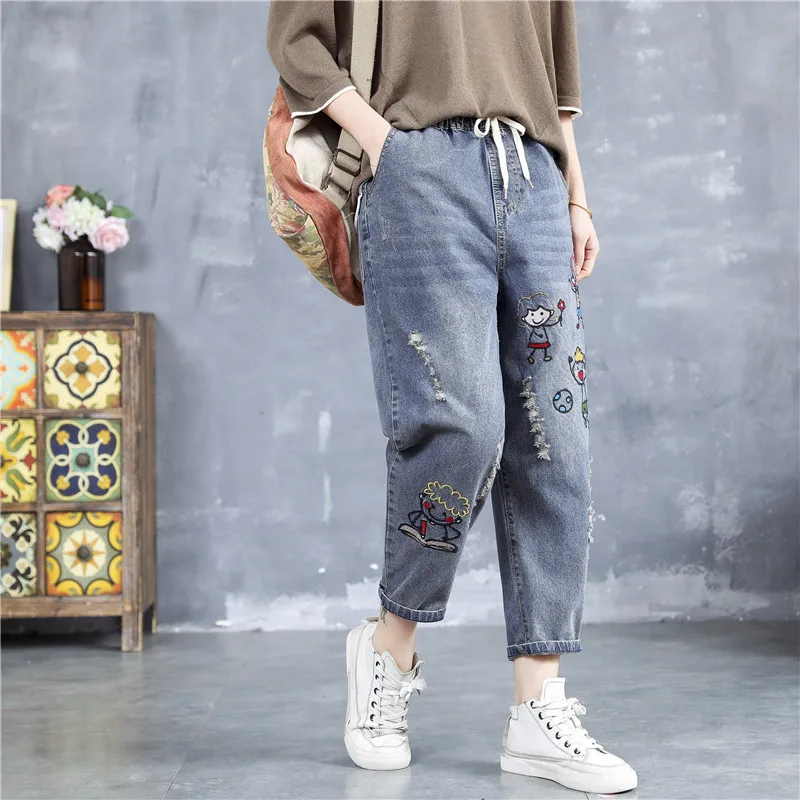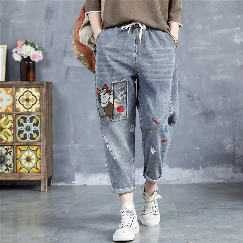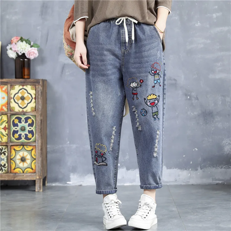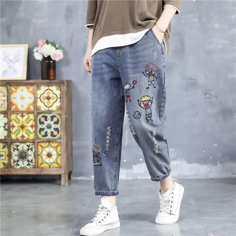 Джинсы султанки с вышивкой и высокой талией женские свободные джинсы в стиле