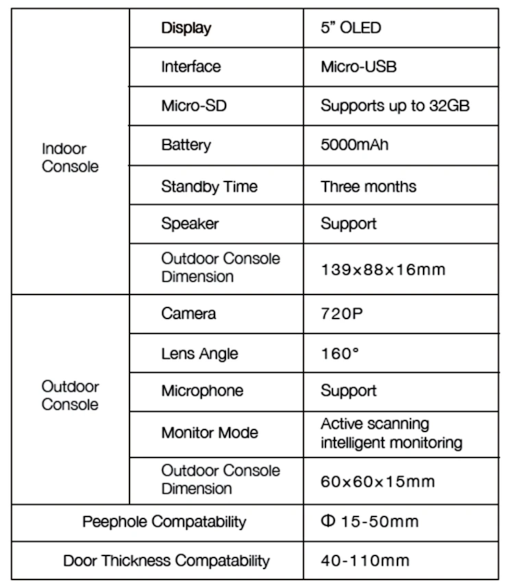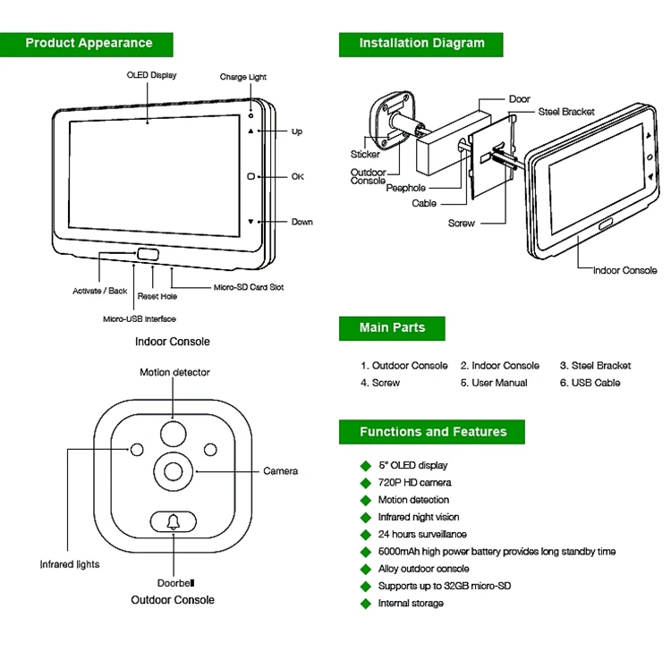 1,5 "OLED дисплей 2,720 P HD камера 3. Функция обнаружения движения 4. Инфракрасное Ночное Видение 5,24 часа наблюдения Аккумулятор высокой мощности 6,5000 мАч обеспечивает длительное время работы в режиме ожидания 7. Напольная консоль из сплава 8. Поддерживает до 32 ГБ micro-SD (не входит в комплект) 9. Внутреннее хранилище (ПЗУ)