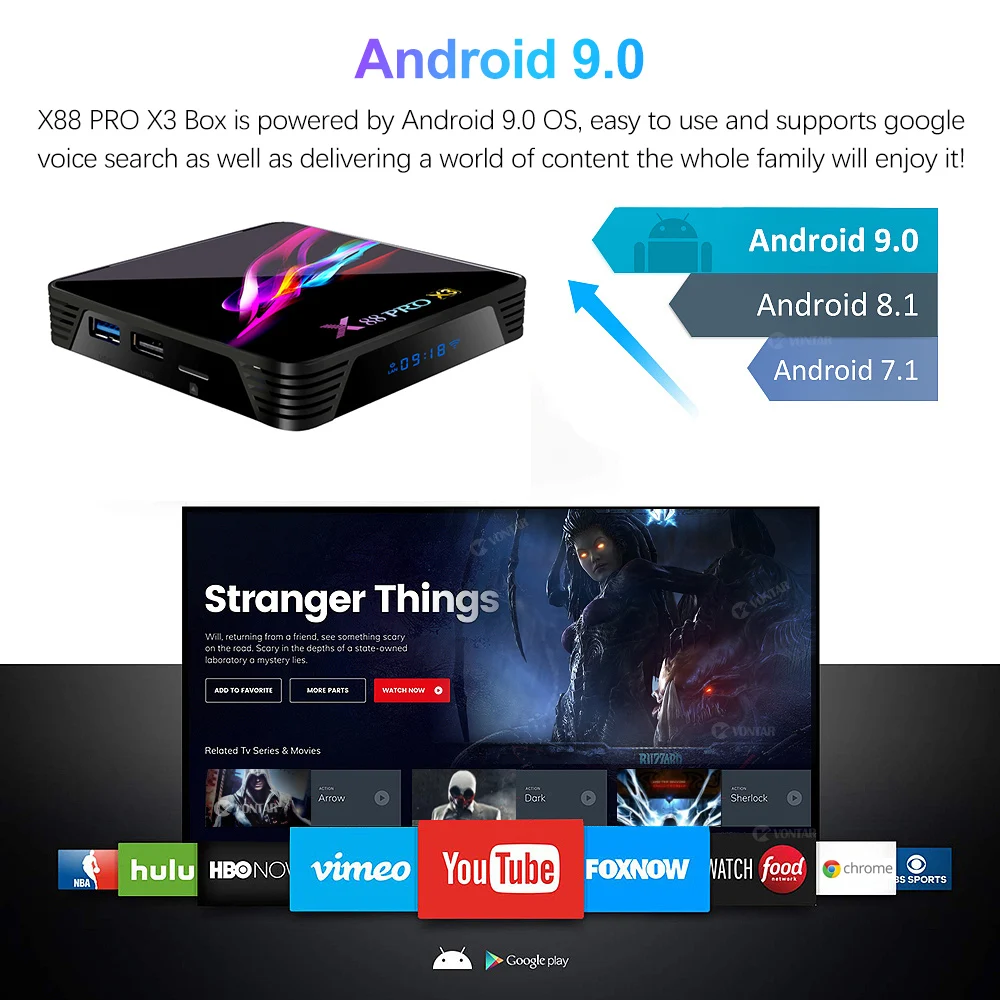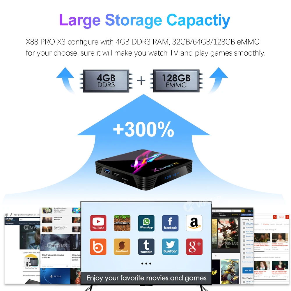 Особенности:1, Процессор: Amlogic S905X3 Quad Core ARM Cortex A55;2, графический процессор: ARM Mali-G31MP;3, ОС: Android 9,0;4, память: DDR3 4 Гб,5, вспышка: 32 ГБ/64 Гб/128 Гб;6, поддержка H.265, 8K @ 24fps, 4K @ 60fps, HD 2,1, USB3.0;7, поддержка: Gigabit Ethernet, 2,4 & 5G Dual Wifi + ac, BT4.1;8, поддержка Youtube HD 4K;9. Поддержка беспроводного обновления (OTA).-Есть 3 варианта X88 PRO X3: