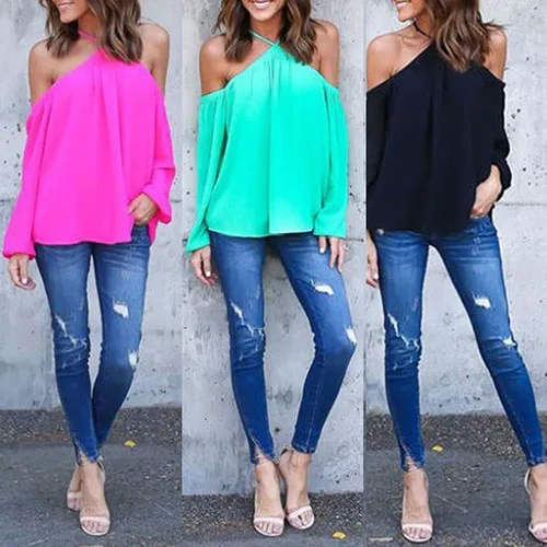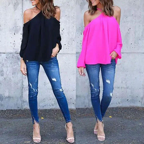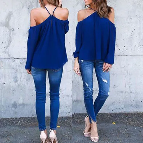 Сексуальное женское летнее платье с лямкой на шее с открытыми плечами, длинный рукав, блузка из шифона Футболка Топ