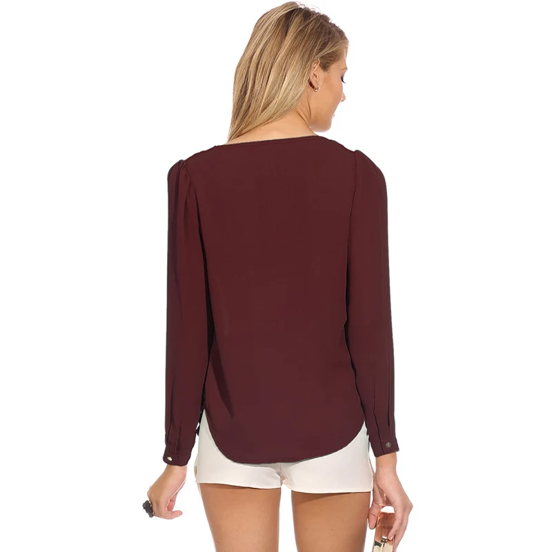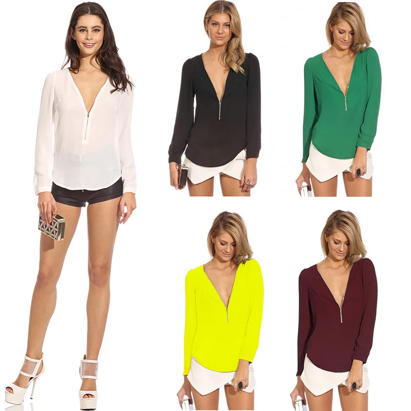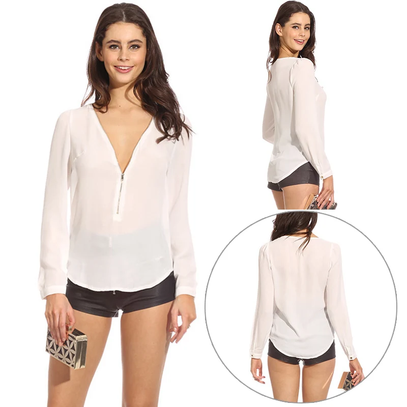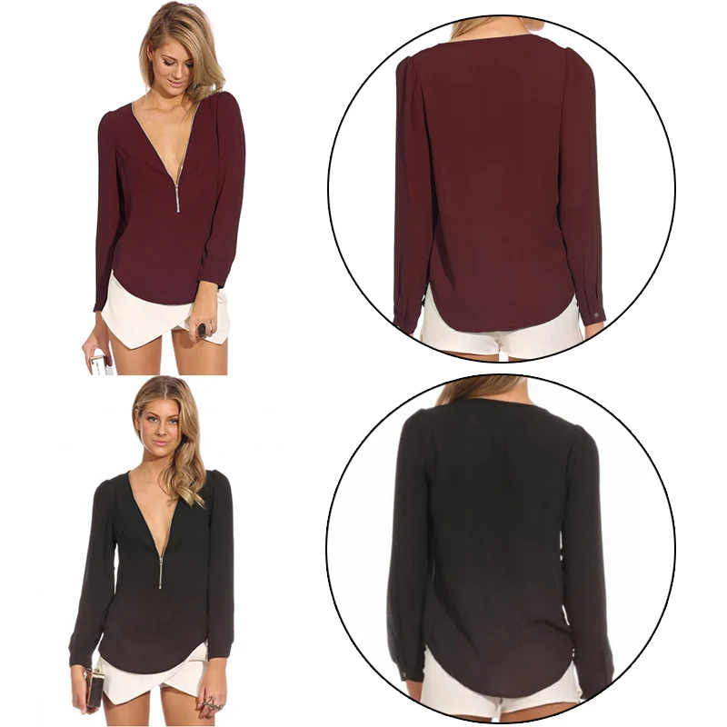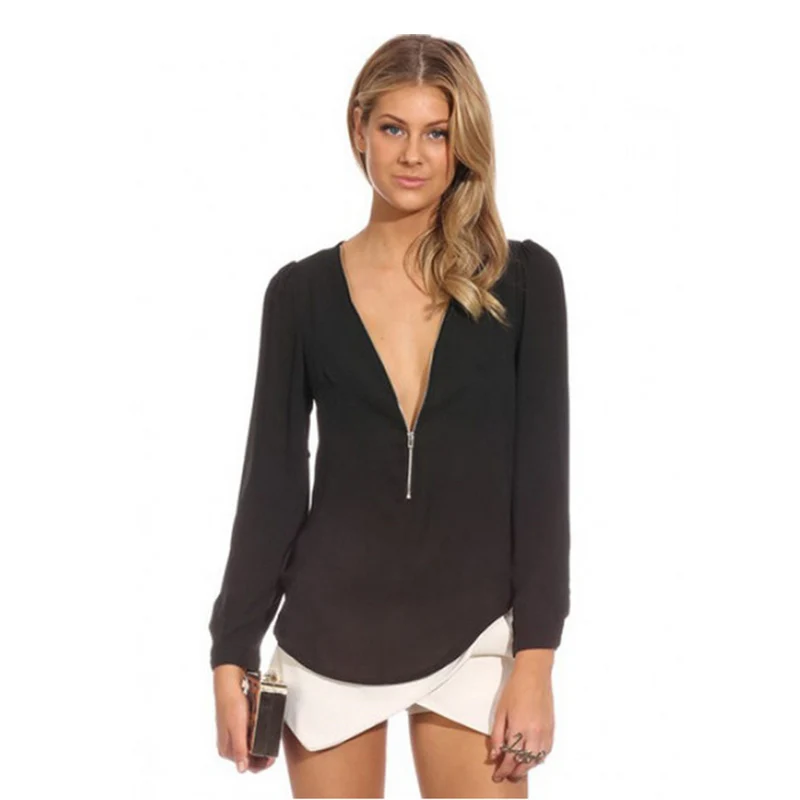 Женская модная шифоновая рубашка с длинным рукавом и v-образным вырезом на молнии