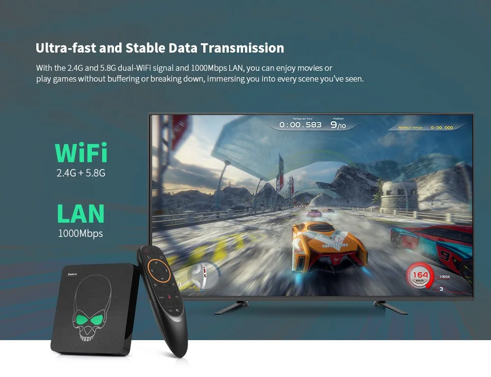 2,4G + 5,8G dual-WiFi и 1000 Мбит/с LAN работают в Интернете, потоковое и аудио без рывков, что позволяет плавно воспроизводить 4 K @ 60 кадров в секунду, 3D и H.256 видео.