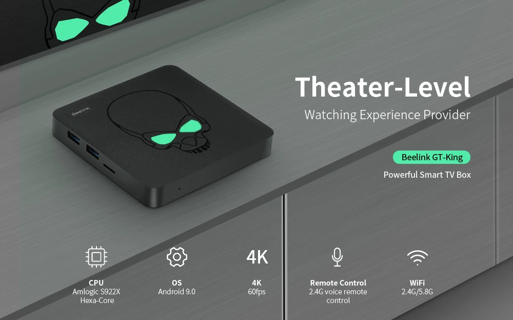 Оснащенный высокопроизводительным шестиядерным процессором Amlogic S922X, ТВ-приставка GT-King работает быстро и плавно с превосходным тепловыделением, никогда не беспокойтесь о буферизации и перегреве во время просмотра фильмов или игр.