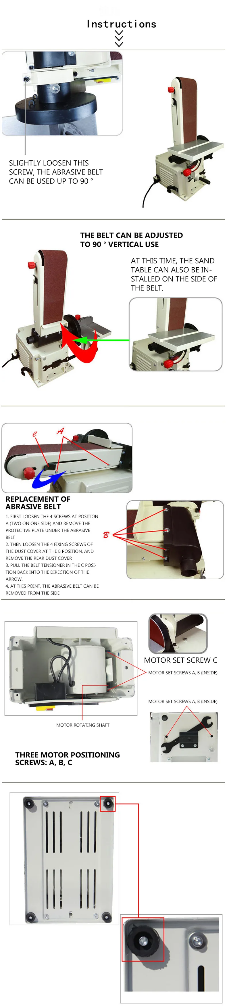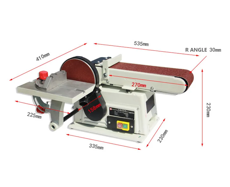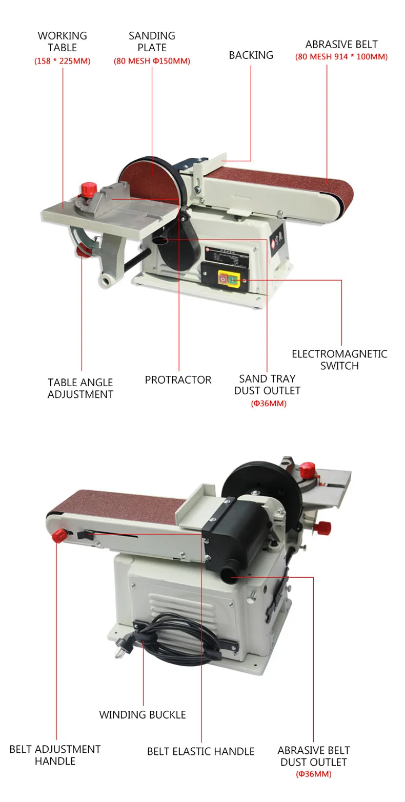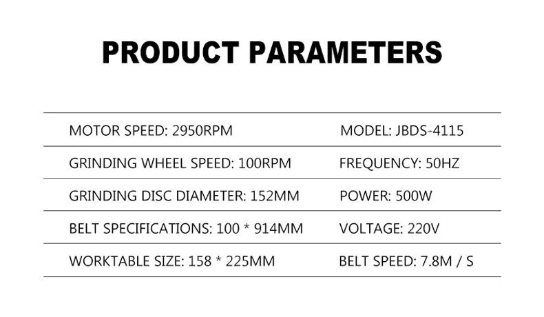 Модель: JBDS-4115 Напряжение: 220V Частота: 50 Гц Мощность: 500W Скорость двигателя: 2950 об/мин Скорость шлифовального круга: 100 об/мин Скорость конвейерной ленты: 7,8 м/с Диаметр шлифовального диска: 152 мм Характеристики ремня: 100*914 мм Размер рабочего стола: 158*225 мм