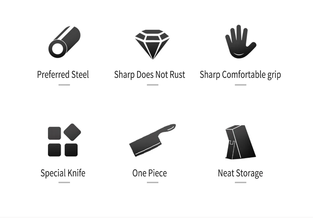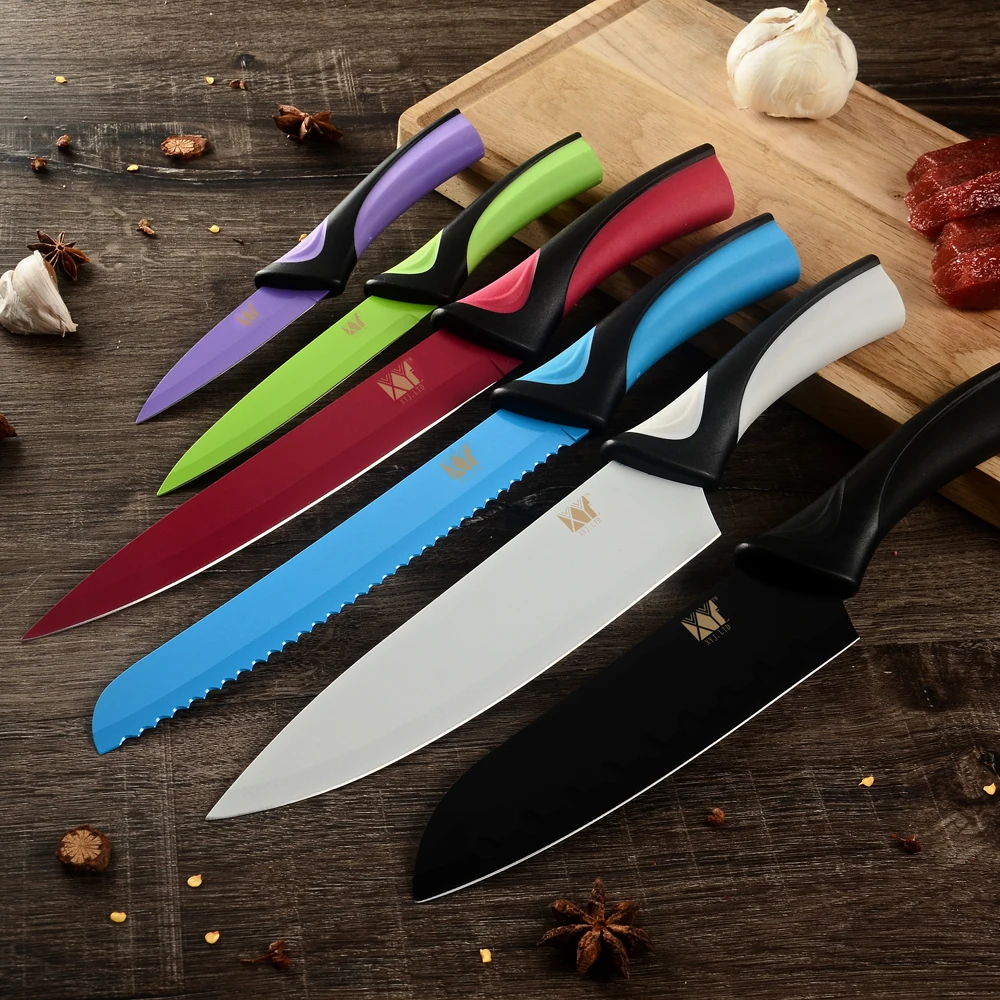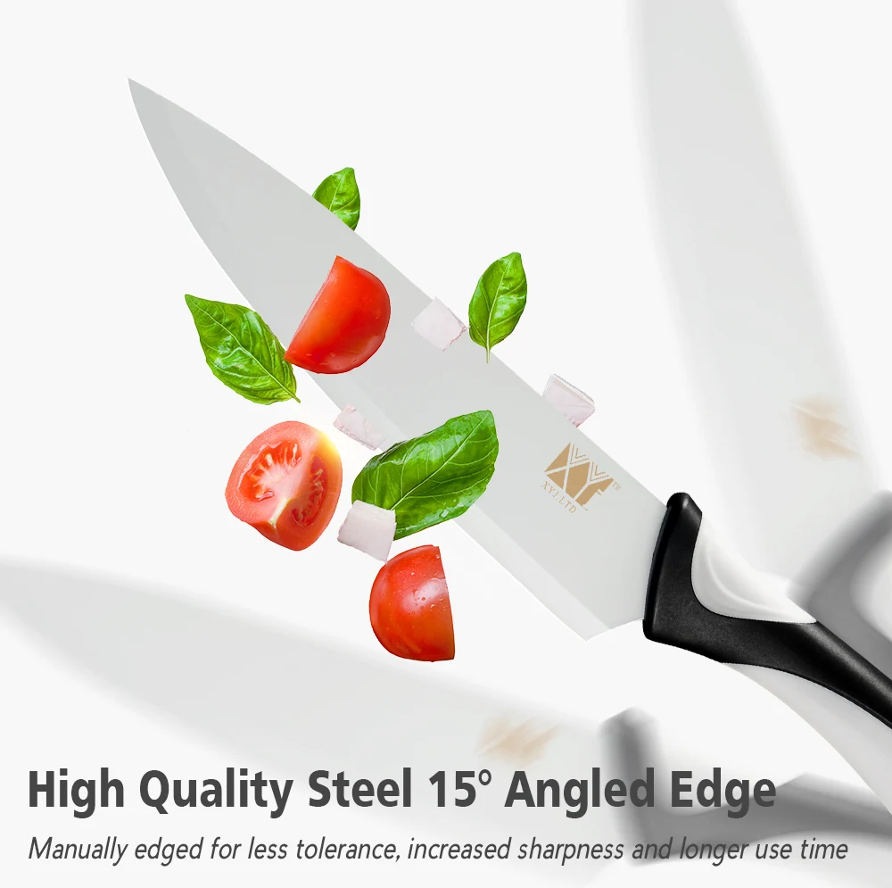 Списки посылка: 8 шт. Набор ножей: 1 * 8-дюймовый нож шеф-повара 1*8 дюймов нож для нарезки 1*8 дюймов нож для хлеба Нож Santoku 1*7 дюймов Универсальный нож 1*5 дюймов 1*3,5 дюйма Фруктовый нож 1*8 дюймов держатель ножа 1 * точилка 6 шт. Набор ножей: 1 * 8-дюймовый нож шеф-повара 1*8 дюймов нож для нарезки 1*8 дюймов нож для хлеба Нож Santoku 1*7 дюймов Универсальный нож 1*5 дюймов 1*3,5 дюйма Фруктовый нож Особенности: Изготовлен из нержавеющей стали 7CR17 хорошего качества Лазерная отделка Антипригарное покрытие Сейф для посудомоечной машины на полке (ручная стирка для достижения наилучших результатов) Эргономичные ручки из полипропилена (ABS + TPR) Цветовая кодировка с шестью фантастическими цветами