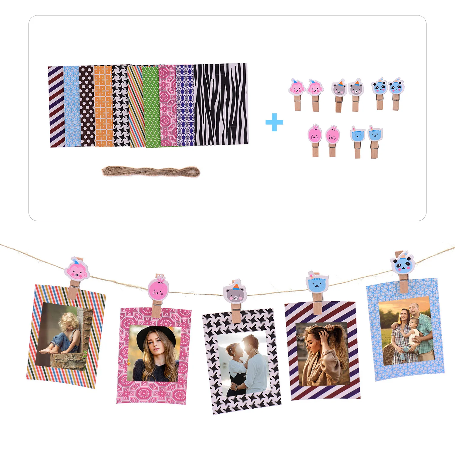 Зажимы для фотографий и подвесная веревка позволяют отображать красивые фотографии на стене.
