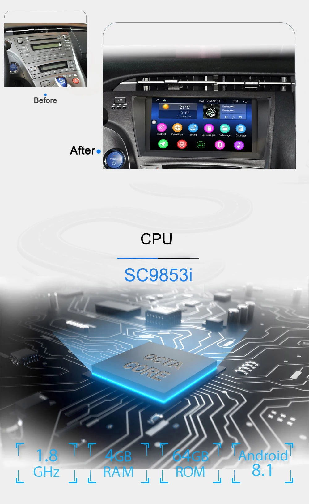 1. Размер сенсорного экрана: 9" 2. Напряжение: 12 В постоянного тока 3. Сопротивление динамика: 4 Ом 4. Максимальная мощность: 4*50 Вт 5. Озу: LPDDR4 4 гб/2 гб (опционально) 6. Флэш-память: EMMC 64 гб/32 гб (опционально) 7. Разрешение: дисплей 1024*600 8. Процессор: SC9853 Octa core 1,8 ГГц