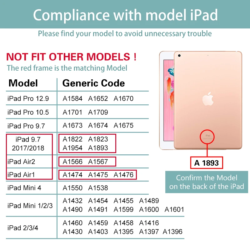Цвета: синий/черный/фиолетовый/розовый/темно-синий/коричневый Подходит для модели: 2017 2018 iPad 5/6-го поколения iPad Air 1/2 (A1474/A1475/A1476/A1566/A1567/A1822/A1823/A1954/A1893) Wegiht: 350 г Материал: искусственная кожа