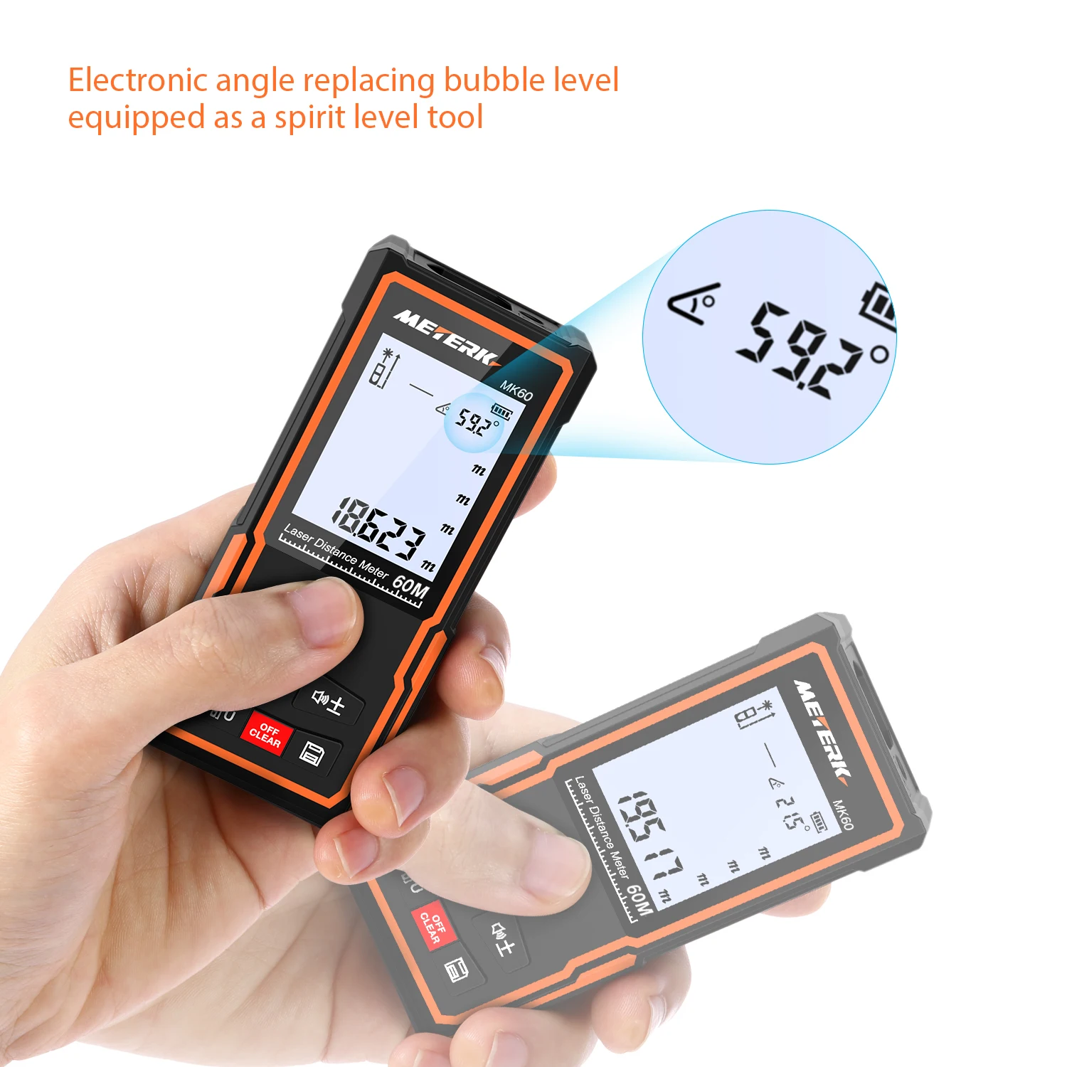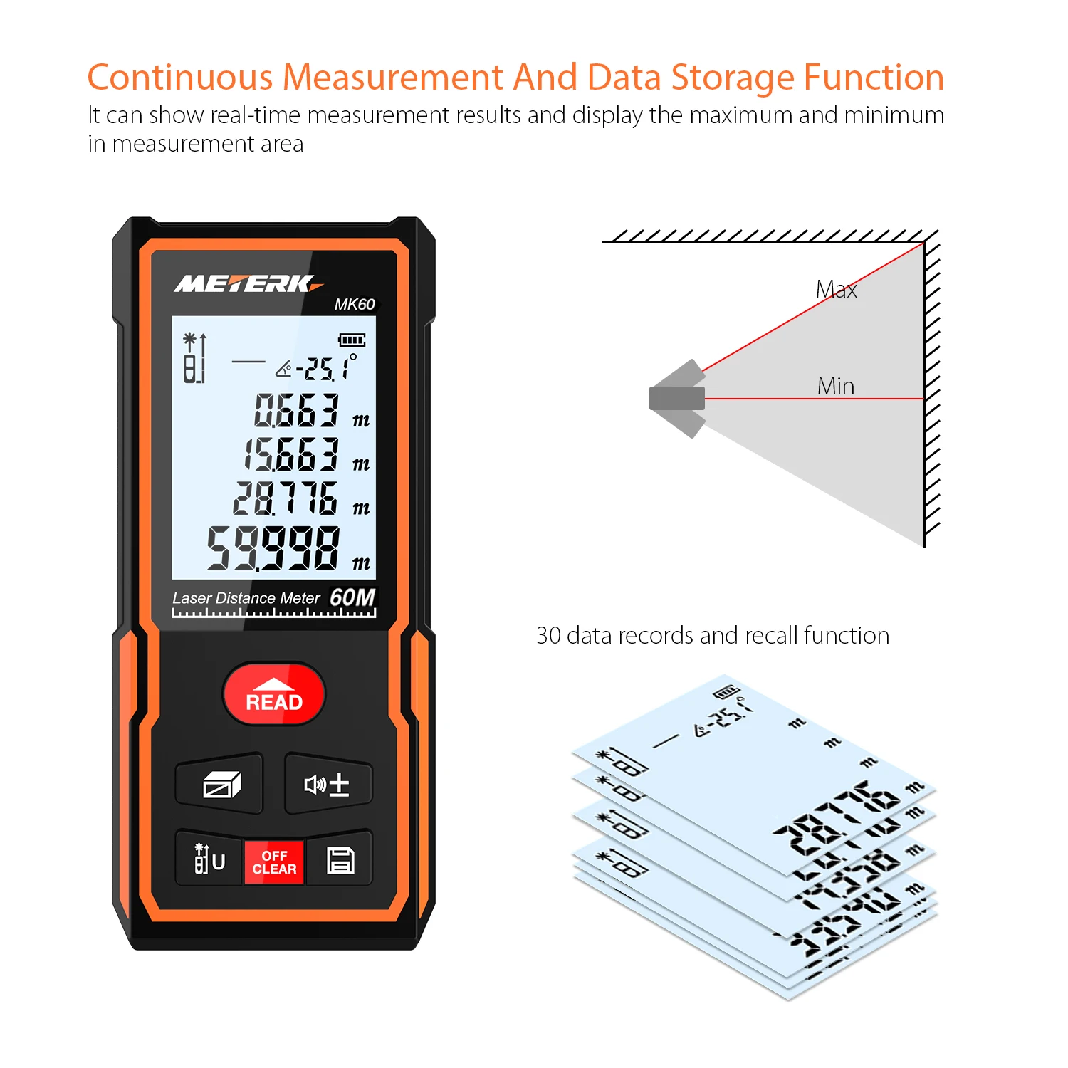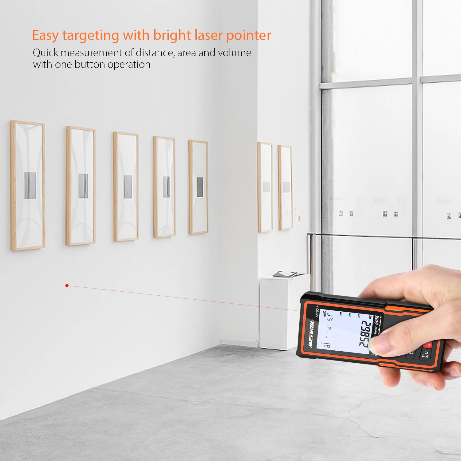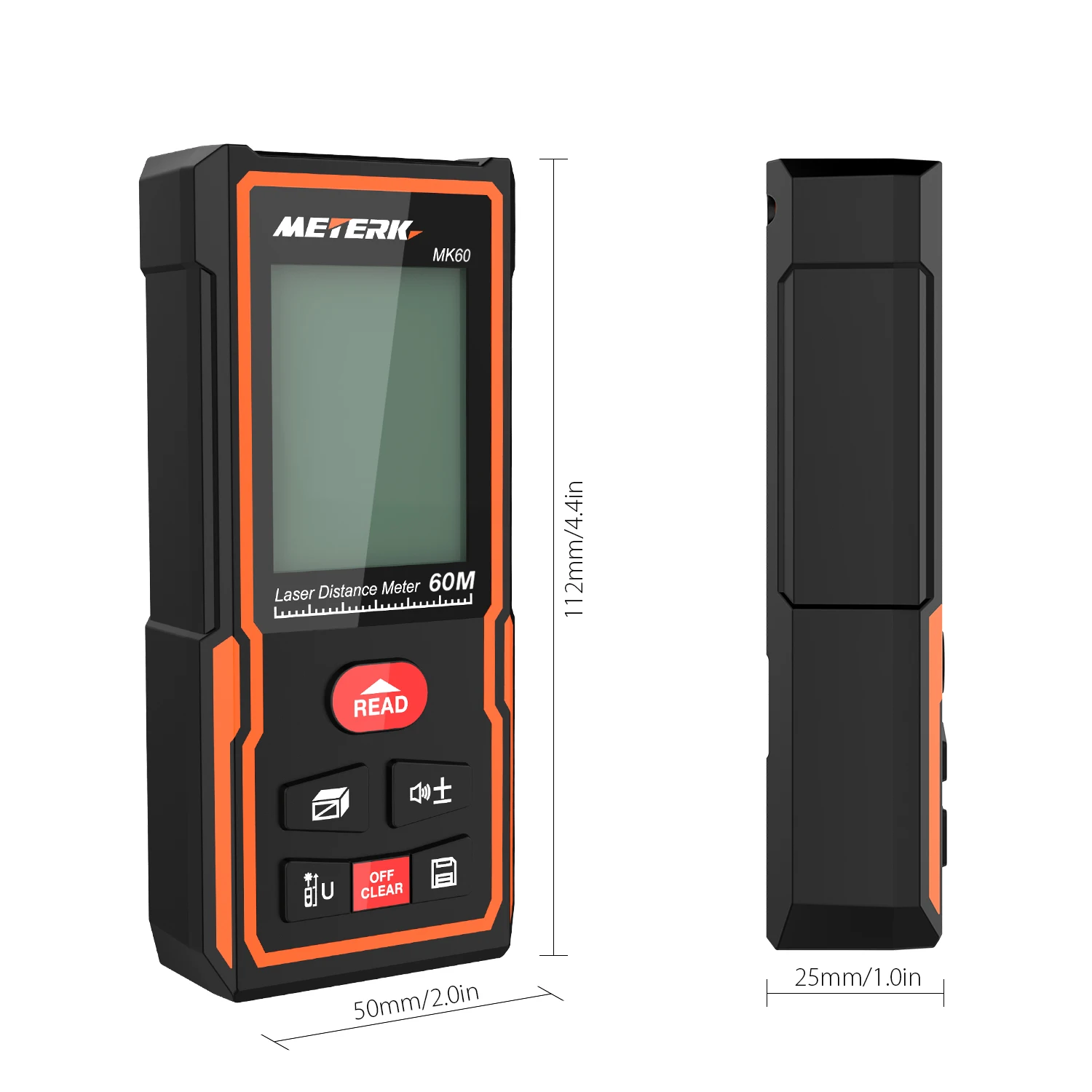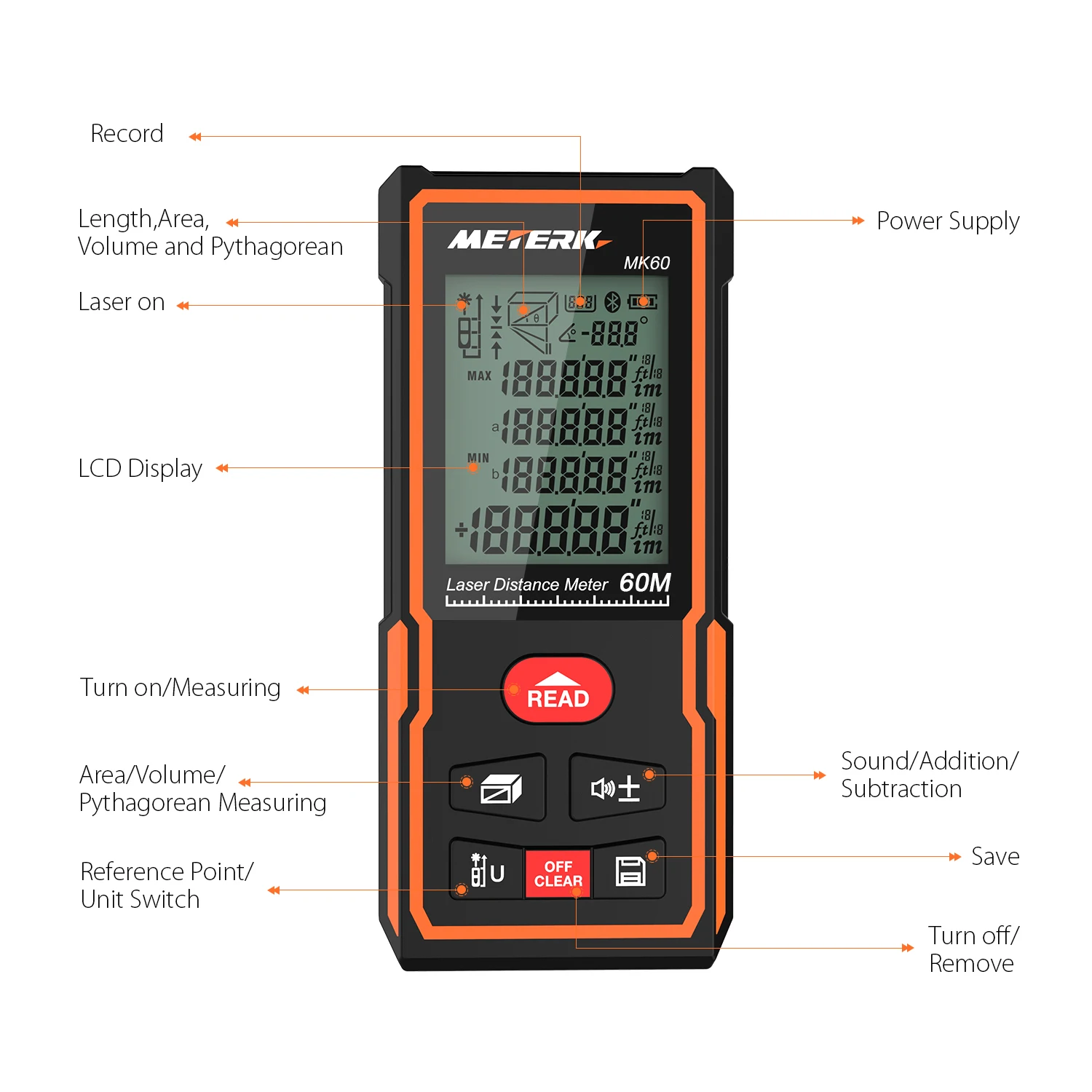 Хотите иметь профессиональный лазерный дальномер с высокой точностью? Попробуйте наш лазерный дальномер Meterk. Он может измерять расстояние, площадь и объем. Он также используется для непрямого измерения с помощью теоремы Пифагора. Простой в эксплуатации, точный в измерении, подходящий размер для вашей ладони, светильник для удобства переноски. Этот лазерный дальномер, как превосходный измерительный инструмент может быть широко использован в строительстве и промышленности, особенно в больших областях, таких как комнаты, квартиры, здания, дома, фабрики, склады и т. Д.