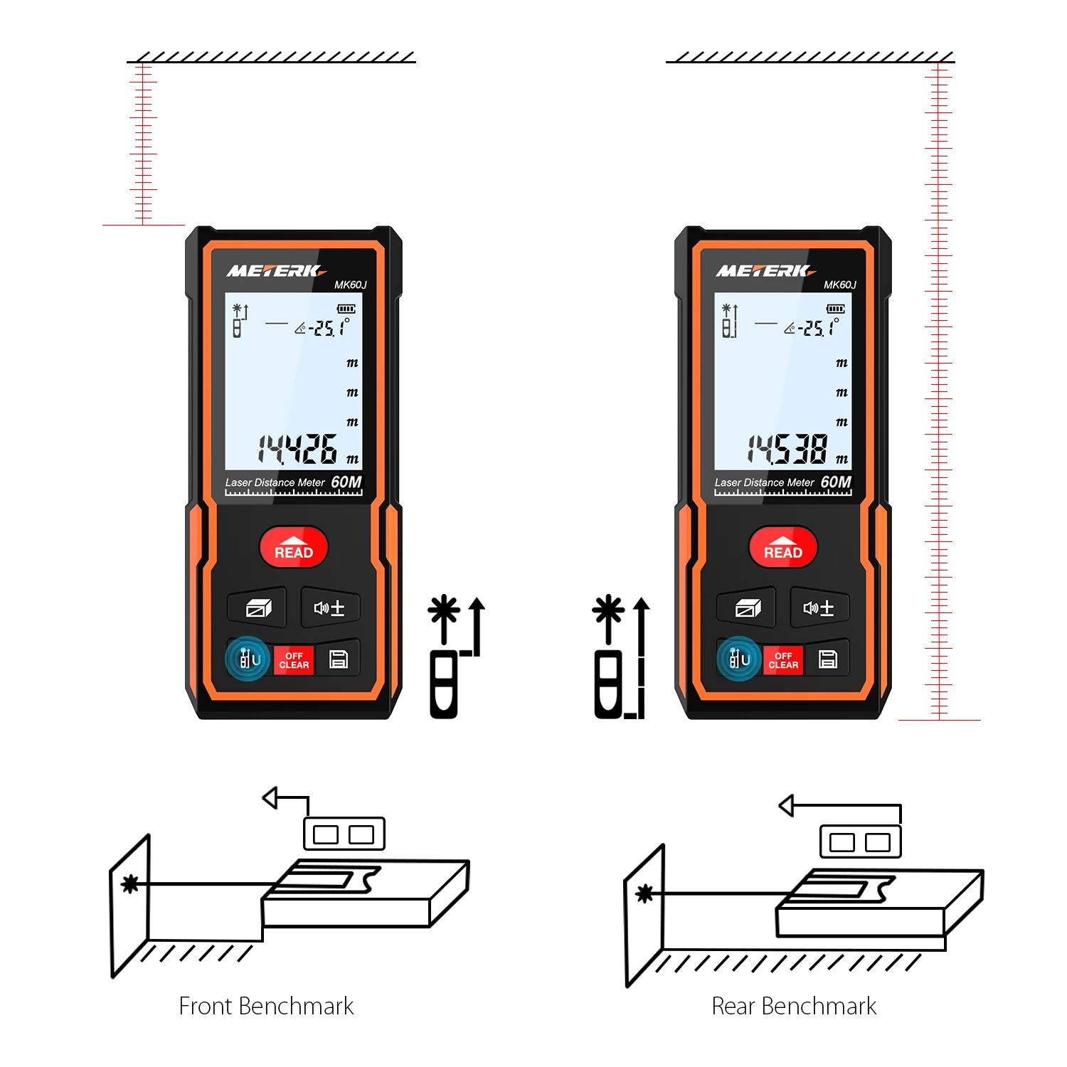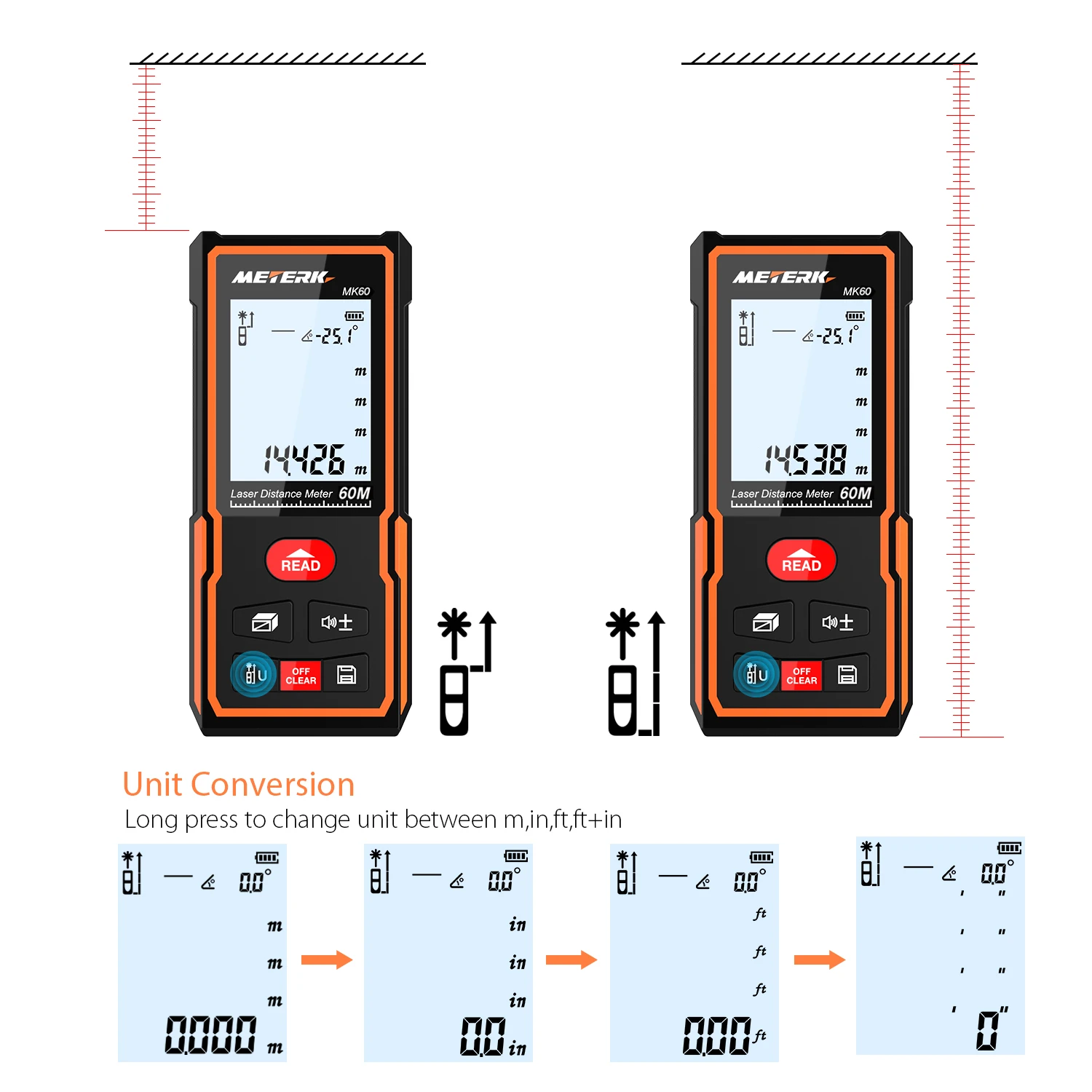 Быстрое измерение расстояния, площади и объема с помощью одной кнопки. Легко наведения с помощью яркой лазерной указки. Переключаемые единицы измерения между измерителями (м), дюймами (в), футами (футы) (в MK60J есть только единицы измерения (м).