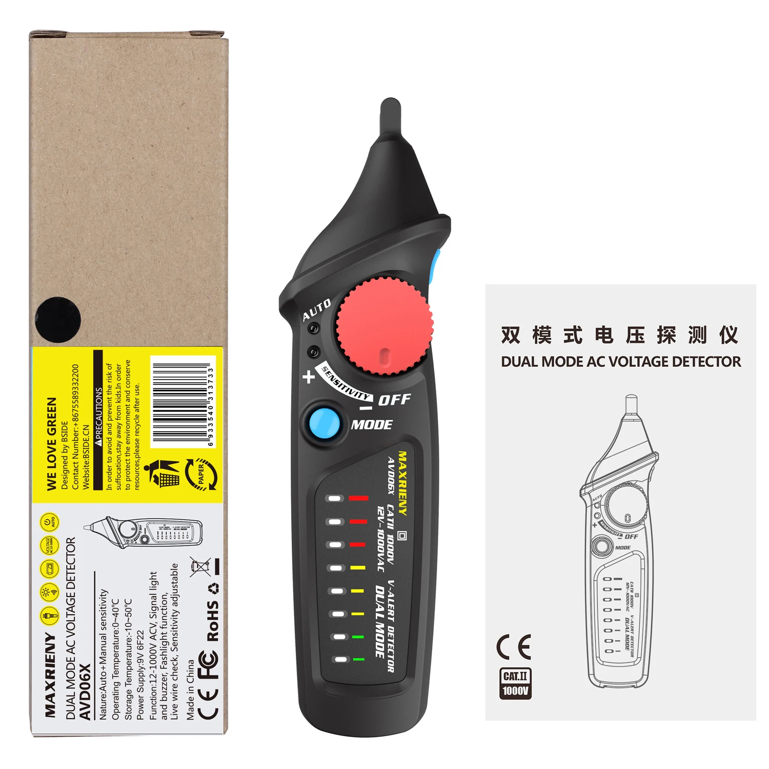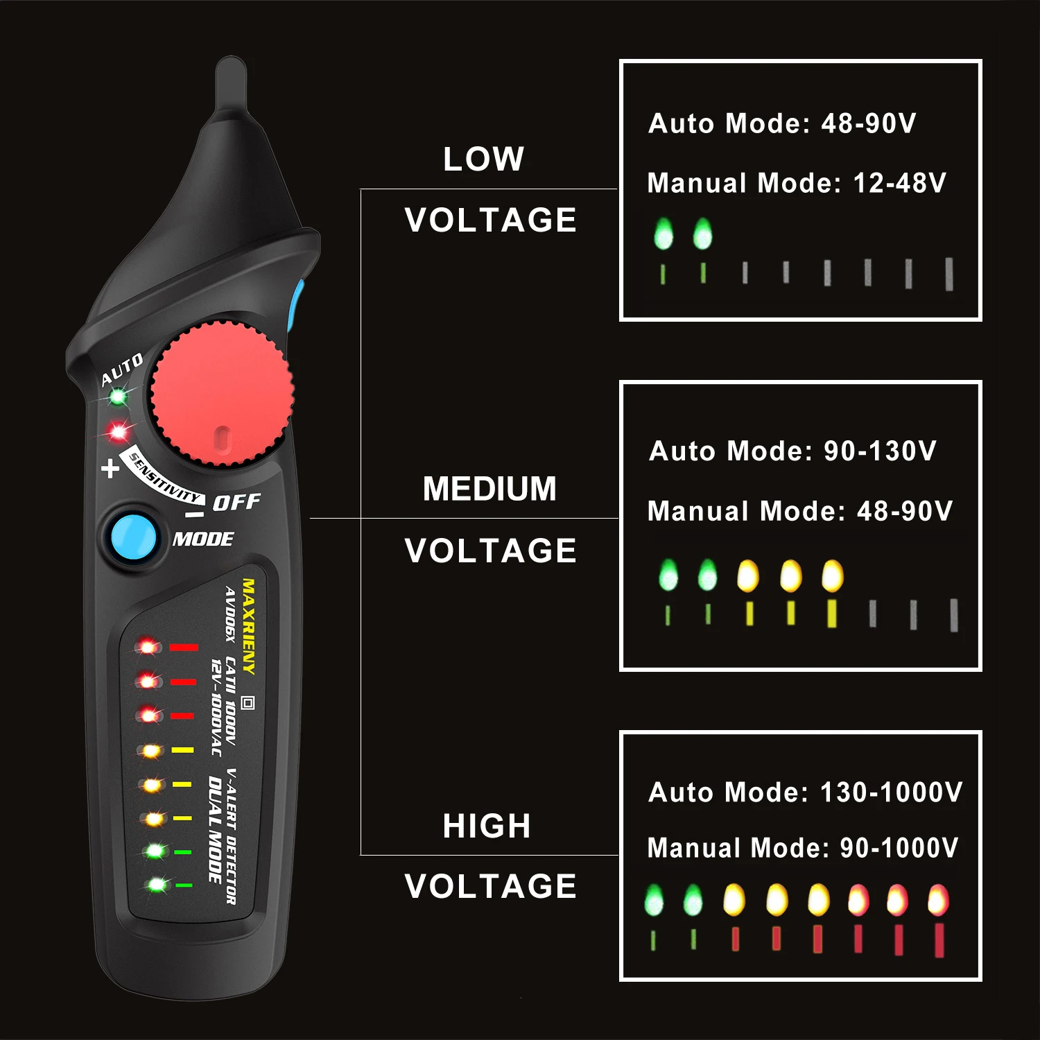 Двойной режим: этот детектор напряжения оснащен ручным/автоматическим режимом, его удобно обнаруживать и указывать на наличие напряжения переменного тока в автоматическом режиме или применять для большего количества случаев в ручном режиме.