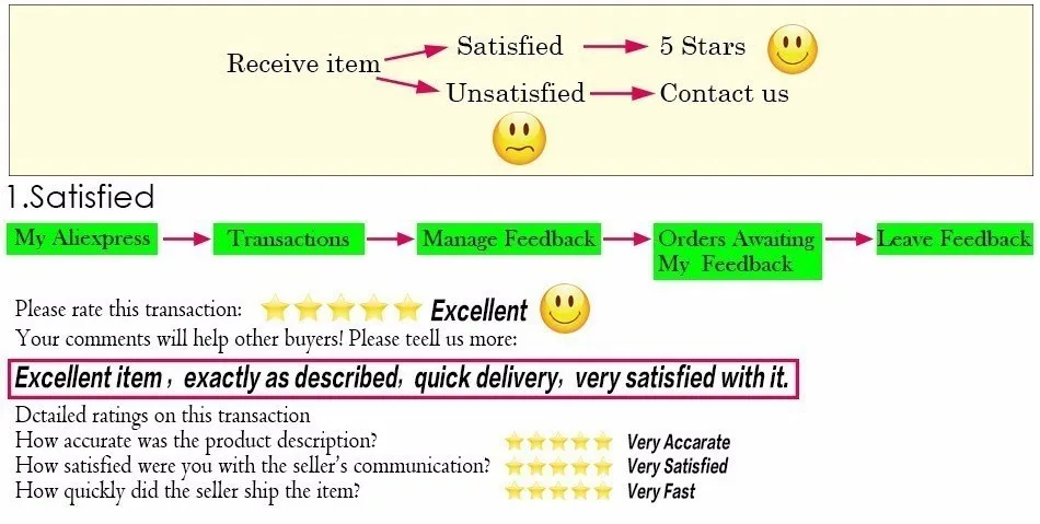1. Если вы удовлетворены нашими продуктами и услугами, пожалуйста, оставьте положительный отзывы и 5 звезд. И оценить качество товара на 5 звезд. Чтобы получить СКИДКУ в 1 доллар США на следующую покупку, пришлите нам скриншот с двумя оценками «5 звезд».