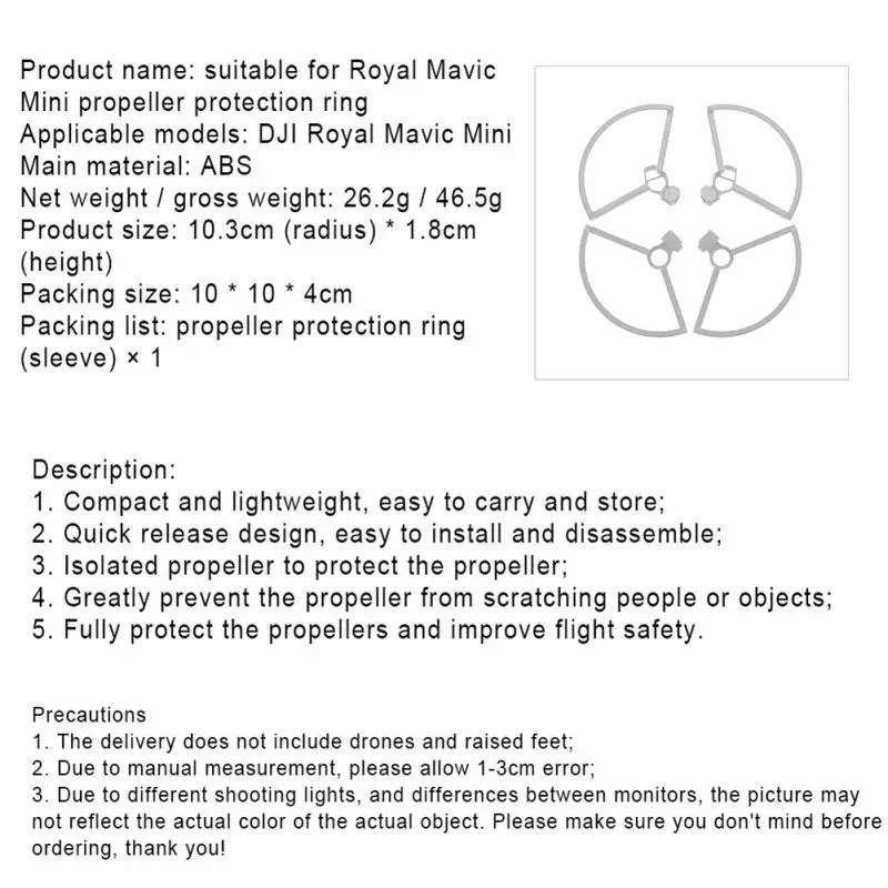 Описание: 1. Легкий и маленький, легко носить с собой и хранить. 2. Быстросъемный дизайн, легко устанавливается и снимается. 3. Изолированный защитный пропеллер. 4. Во многих случаях пропеллер не царапает людей или предметы. 5. Полностью защищает пропеллеры и повышает безопасность полета. Технические характеристики: Материал: АБС-пластик Тип изделия: защита пропеллера Цвет: как на картинке Применимые модели: для Mavic Вес нетто: 26,2 г Вес брутто: 46,5 г Посылка включает в себя: 1 комплект защитных пропеллеров Примечания: 1. Замеры сделаны вручную, поэтому возможны отклонения на 1-3 мм. 2. Из-за различных дисплеев и разного светильник, изображение может не отражать фактический цвет изделия. Спасибо за понимание.