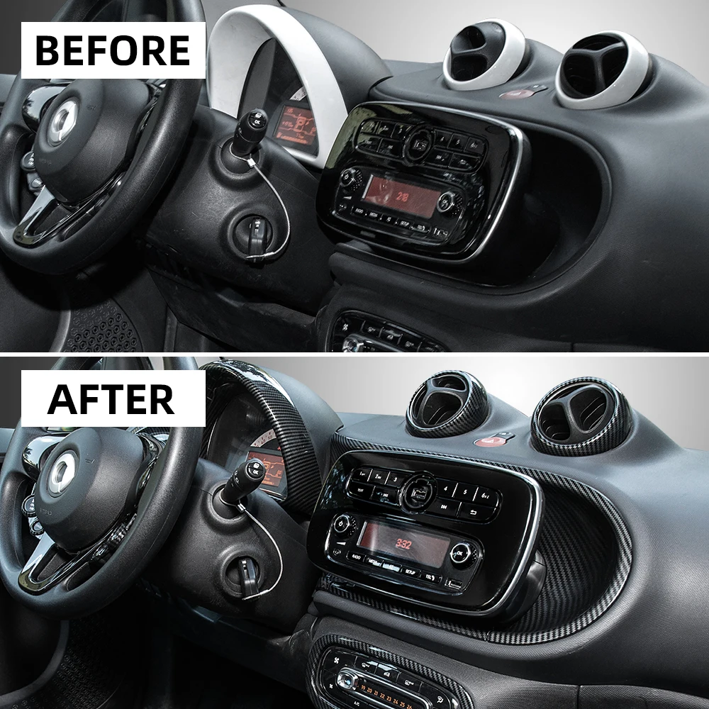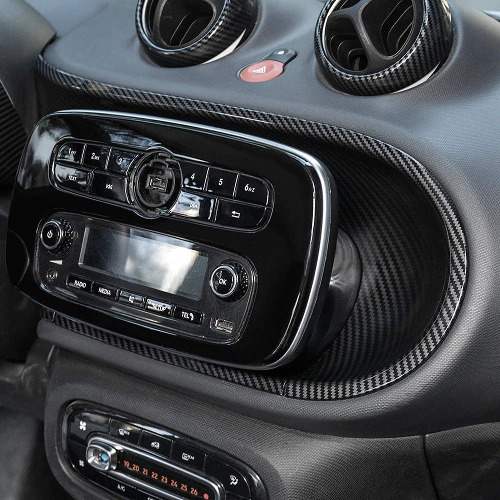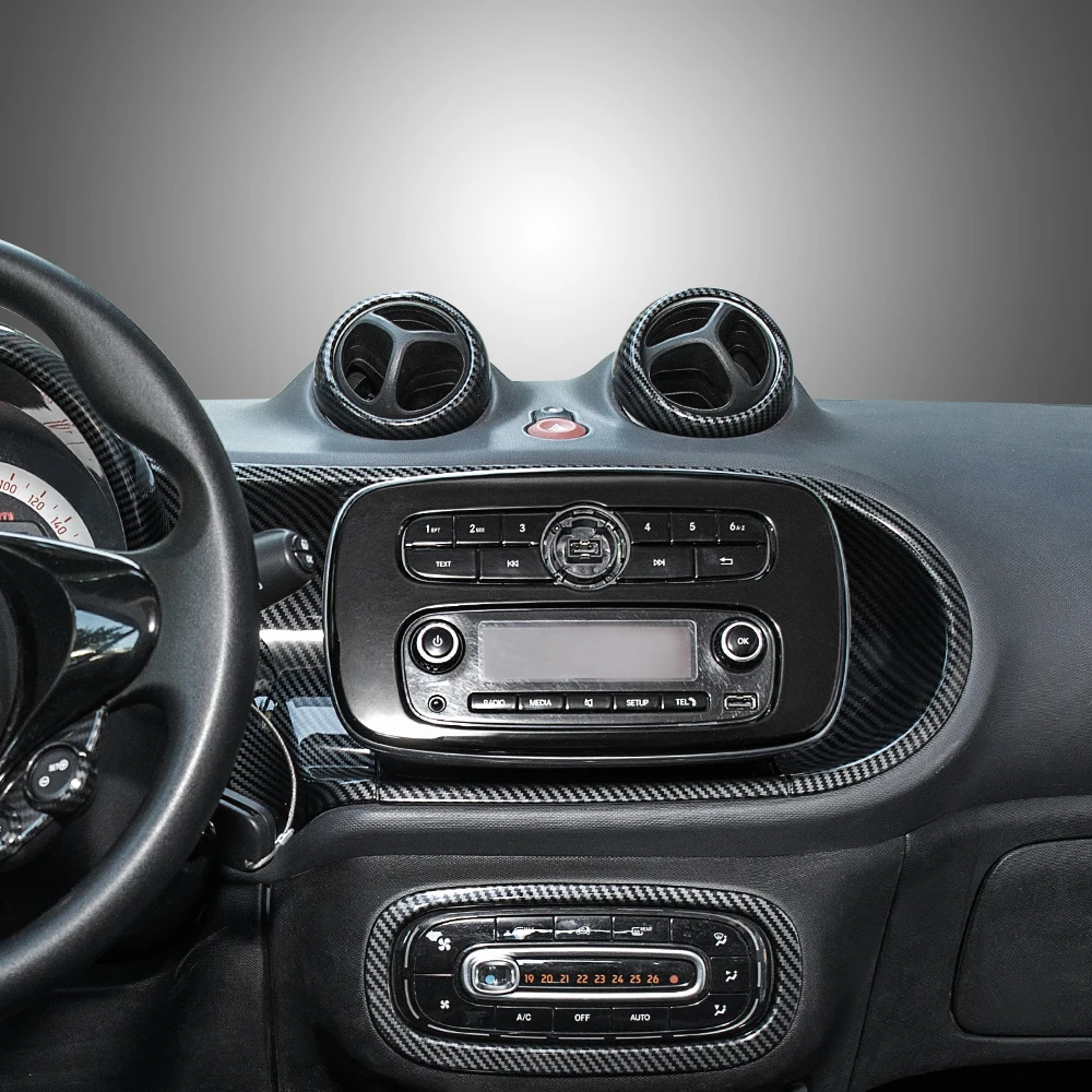 -Материал изделия: АБС-пластик -Применимые модели: для Smart fortwo/forfour 2015-2019 -Наименование товара: Автомобильная центральная консоль декоративная панель из углеродного волокна -Способ установки: паста