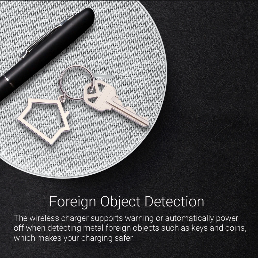 The wireless charger supports warning or automatically power off when detecting metal foreign objects such as keys and coins, which makes your charging safer.