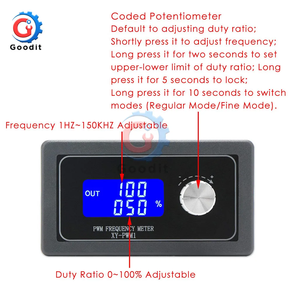 Параметры: Рабочее напряжение: DC 3,3-30 в Частотный диапазон: нормальный режим 1 Гц-150 кГц, точный режим 1 Гц-15 кГц Точность частоты: 2% в каждом диапазоне Грузоподъемность сигнала: выходной ток около 5-30 мА Выходная Амплитуда: амплитуда ШИМ равна входному значению напряжения Рабочая температура: -20 -70 ℃ Диапазон рабочего цикла: 0-100% Особенности: Осветительные приборы с 2 режима. Управляется кодовым потенциометром. С функцией блокировки, чтобы избежать неправильной работы. Верхняя и нижняя границы рабочего цикла регулируются. 2 режима: Обычный режим: Частотный диапазон 1 Гц-150 кГц, рабочий цикл 000-100%, рабочий цикл шаг 1% Точный режим: Частотный диапазон 1 Гц-15 кГц, рабочий цикл 00,0-100%, рабочий цикл шаг 0.1% Применение: Как генератор сигналов прямоугольной волны для экспериментальной разработки Как квадратный генератор волнового сигнала для мотора Как Регулируемый импульсный генератор для MCU Как генератор импульсов, схемы управления (PWM затемнения, регулирование скорости). Частота Дисплей Инструкция: Частота делится на 4 диапазона и переключается автоматически. 1. XXX: Минимальный блок 1 Гц, диапазон значений 1 Гц ~ 999 Гц. 2. X.XX: минимальная единица 0,01 кГц, диапазона значений 1,00 кГц ~ 9,99 кГц. 3. X X.X: минимальная единица 0,1 кГц; Диапазона значений 10,0 кГц ~ 99,9 кГц. 4. X.X.X: минимальная единица 1 кГц; Диапазон значений 1 кГц ~ 150 кГц. Е. Г. Частота Отображает 100 представляет 100 Гц Отображает 1,01 на 1,01 кГц Отображает 54,1 на 54,1 кГц Дисплеи 1.2.4 представляют 124 кГц Посылка включает в себя: 1 * Многофункциональный Генератор сигналов
