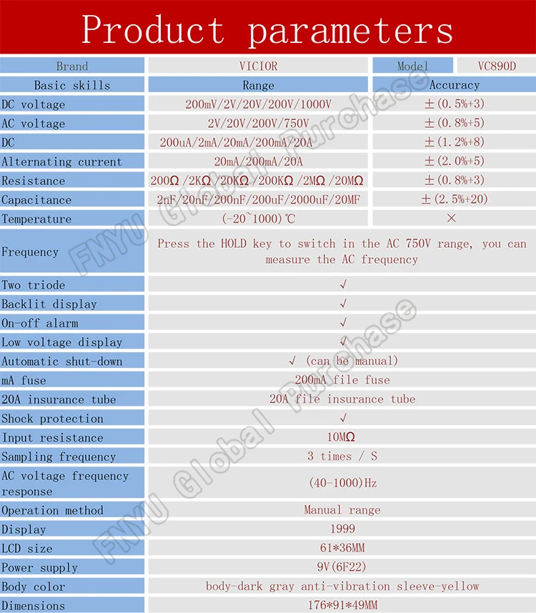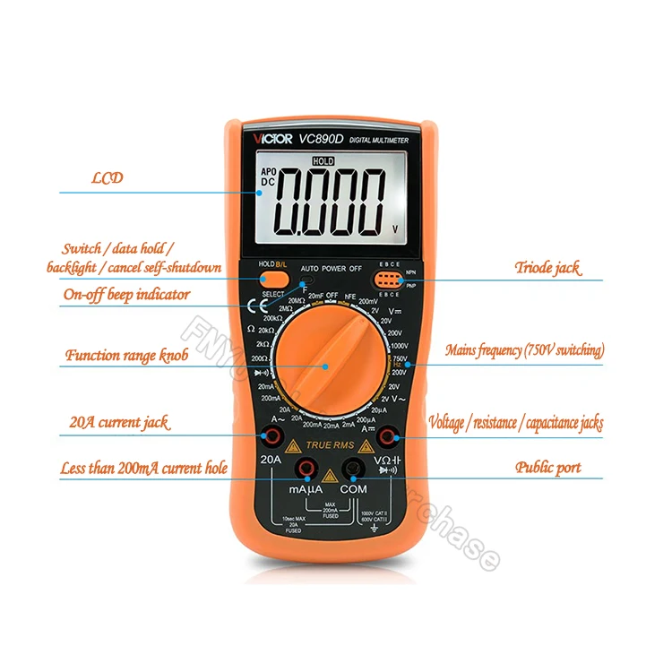 Измеритель серии VC890D-это своего рода стабильный и надежный цифровой мультиметр с батарейным приводом. Измеритель использует 40 мм высокий ЖК-дисплей. Чтение четкое и простое в использовании. Может использоваться для измерения напряжения постоянного тока и напряжения переменного тока, переменного тока и постоянного тока, сопротивления, емкости, диода, триода, непрерывности, температуры, автоматического выключения, функции подсветки и т. д. Вся машина использует двойное интегральное преобразование A / D в качестве ядра. Идеальный инструмент для лабораторий, фабрик, радио энтузиастов и семей