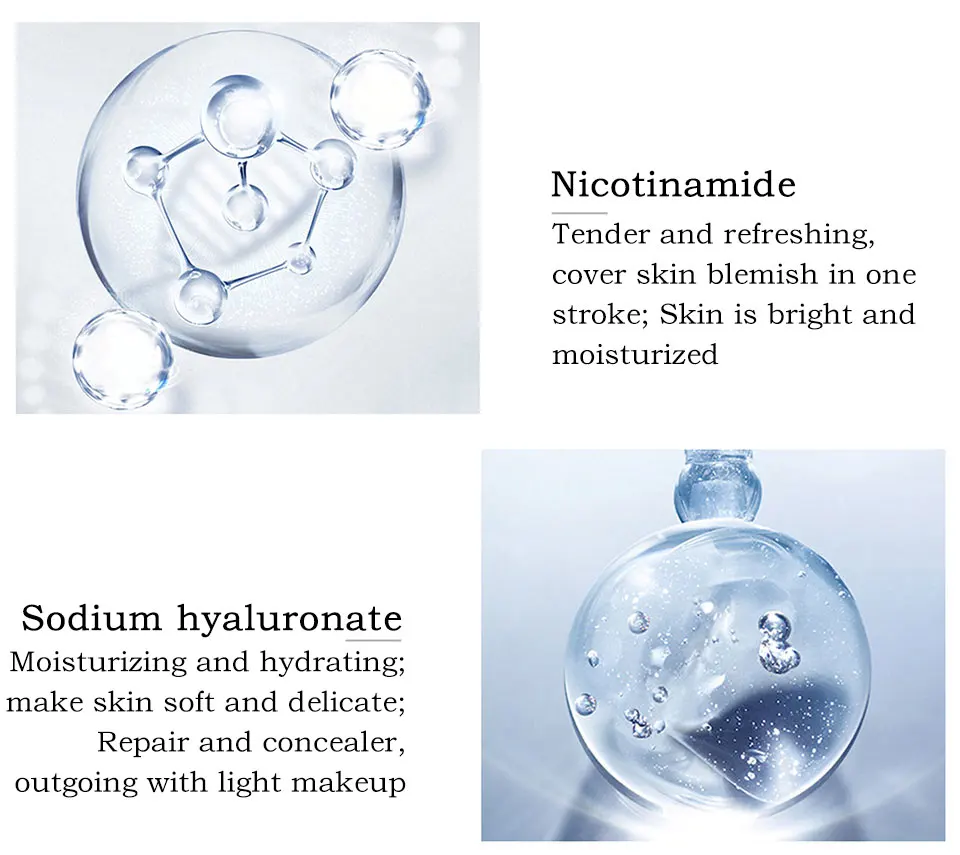 Никотинамид Нежный и освежающий, покрывает дефект кожи одним движением; Кожа яркая и увлажненная Гиалуроновая кислота Увлажнение и увлажнение; Делает кожу мягкой и деликатной; Восстанавливает и маскирует, снимает макияж и светильник