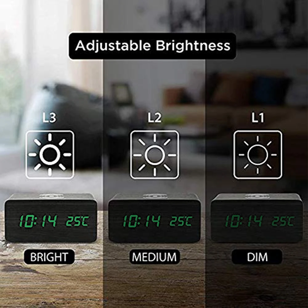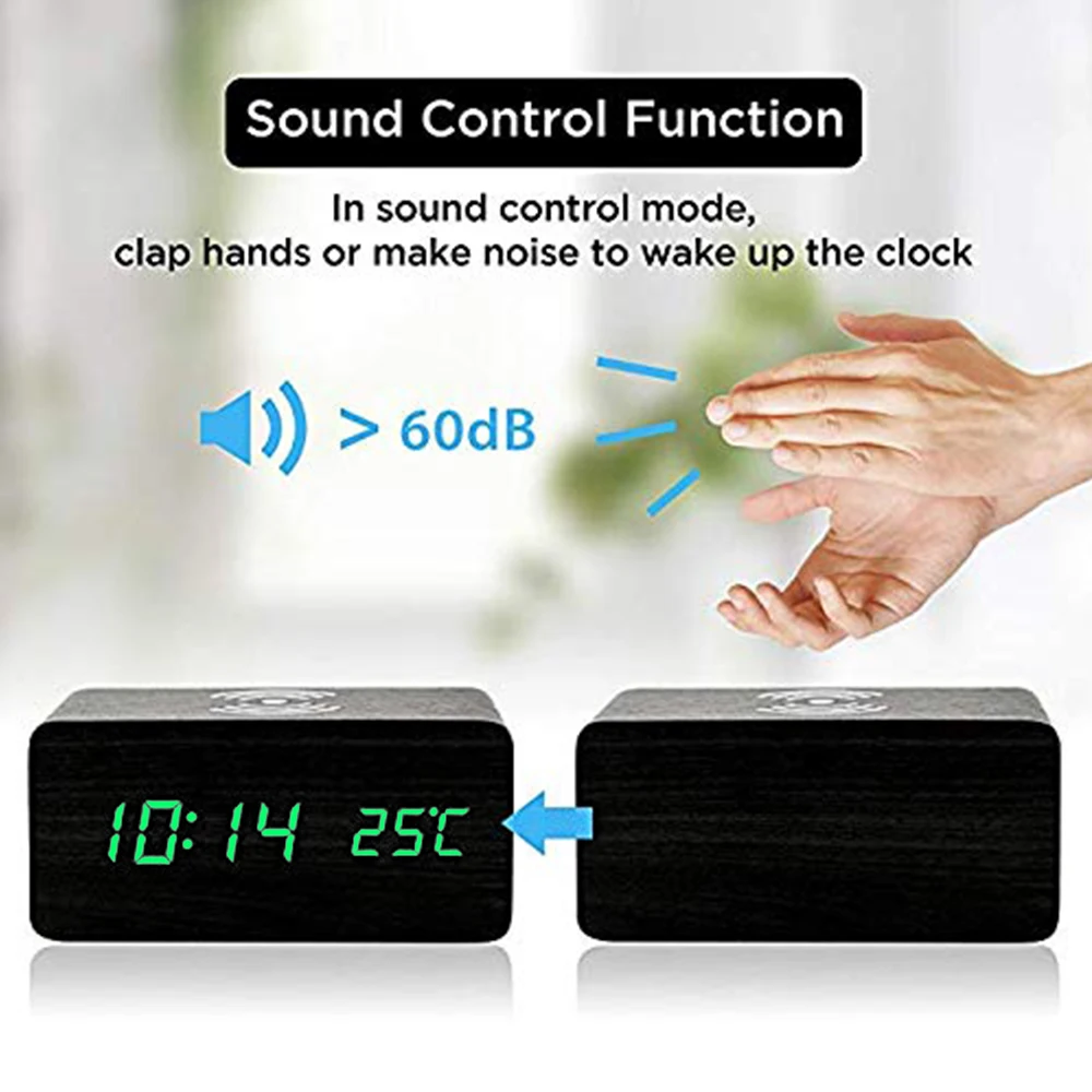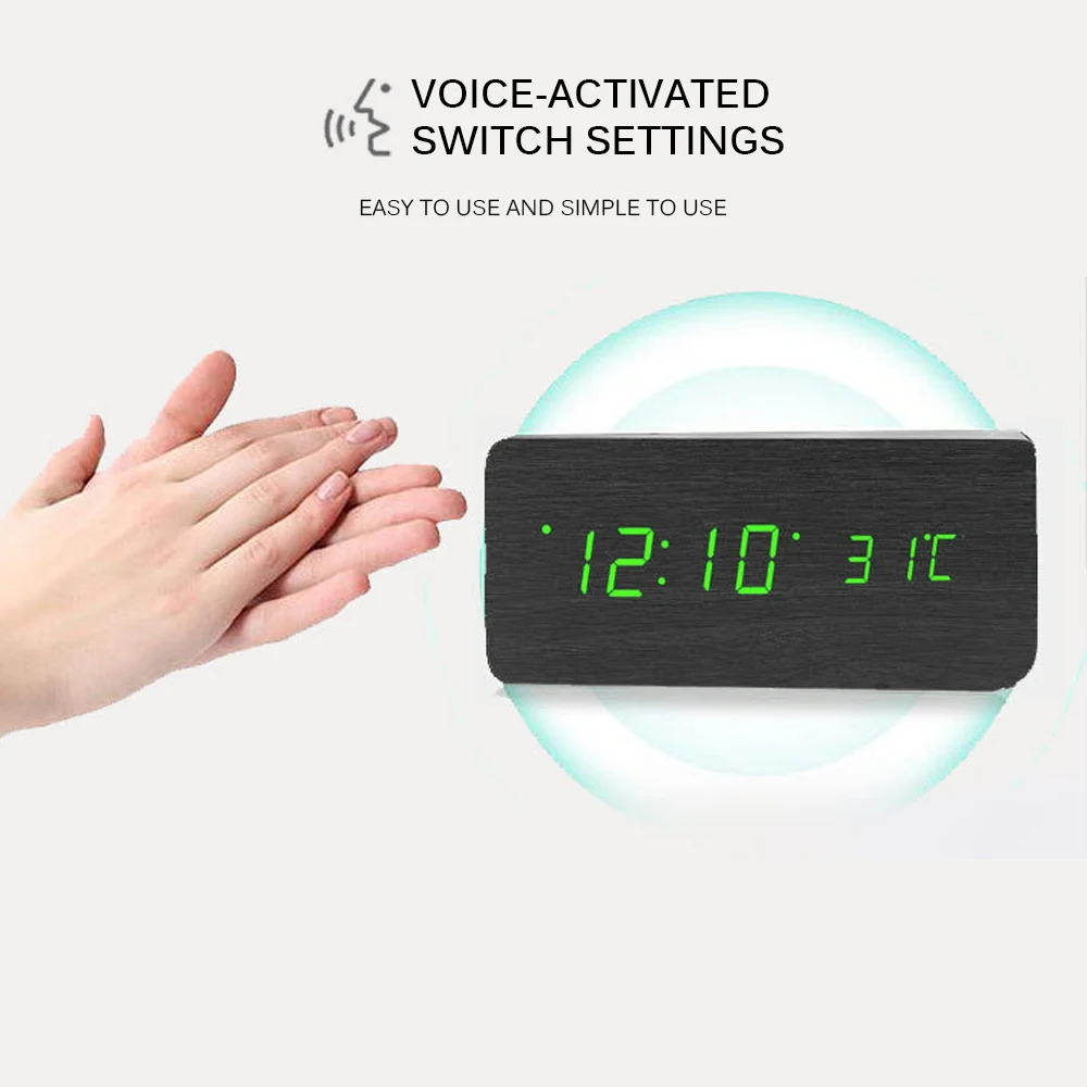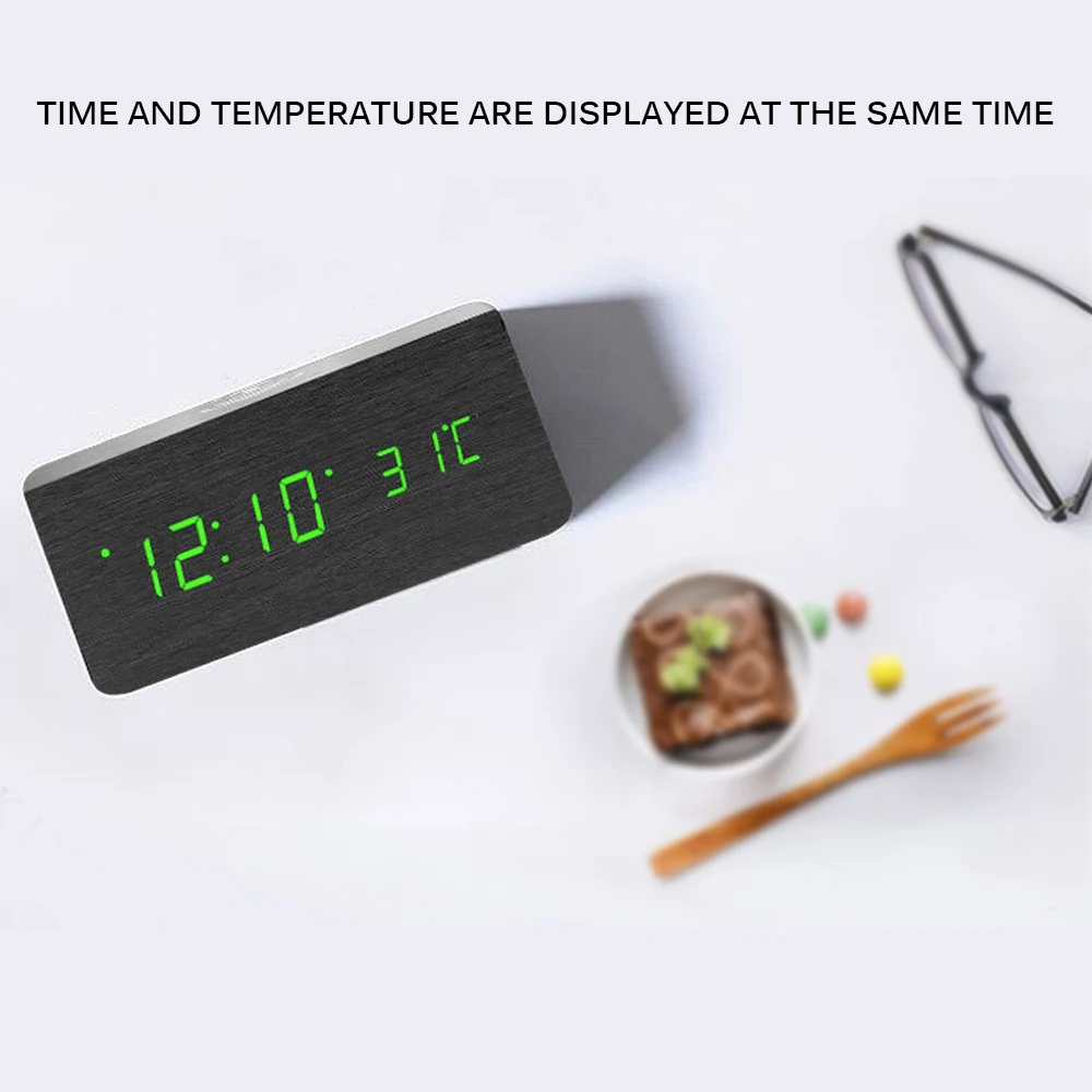 Деревянный Будильник с зелеными цифровыми часами может записывать три набора будильника одновременно, который также может показать вам данные о температуре, календаре и времени.