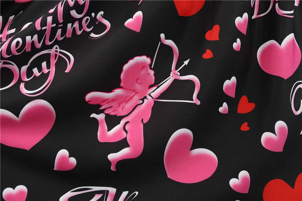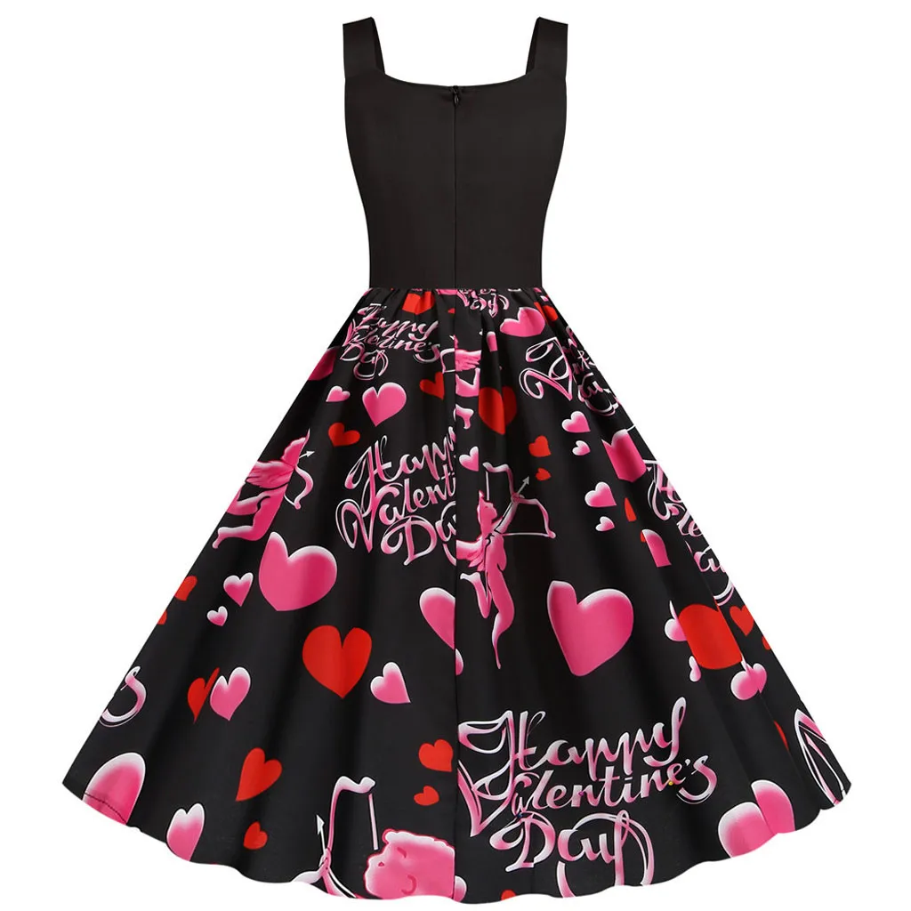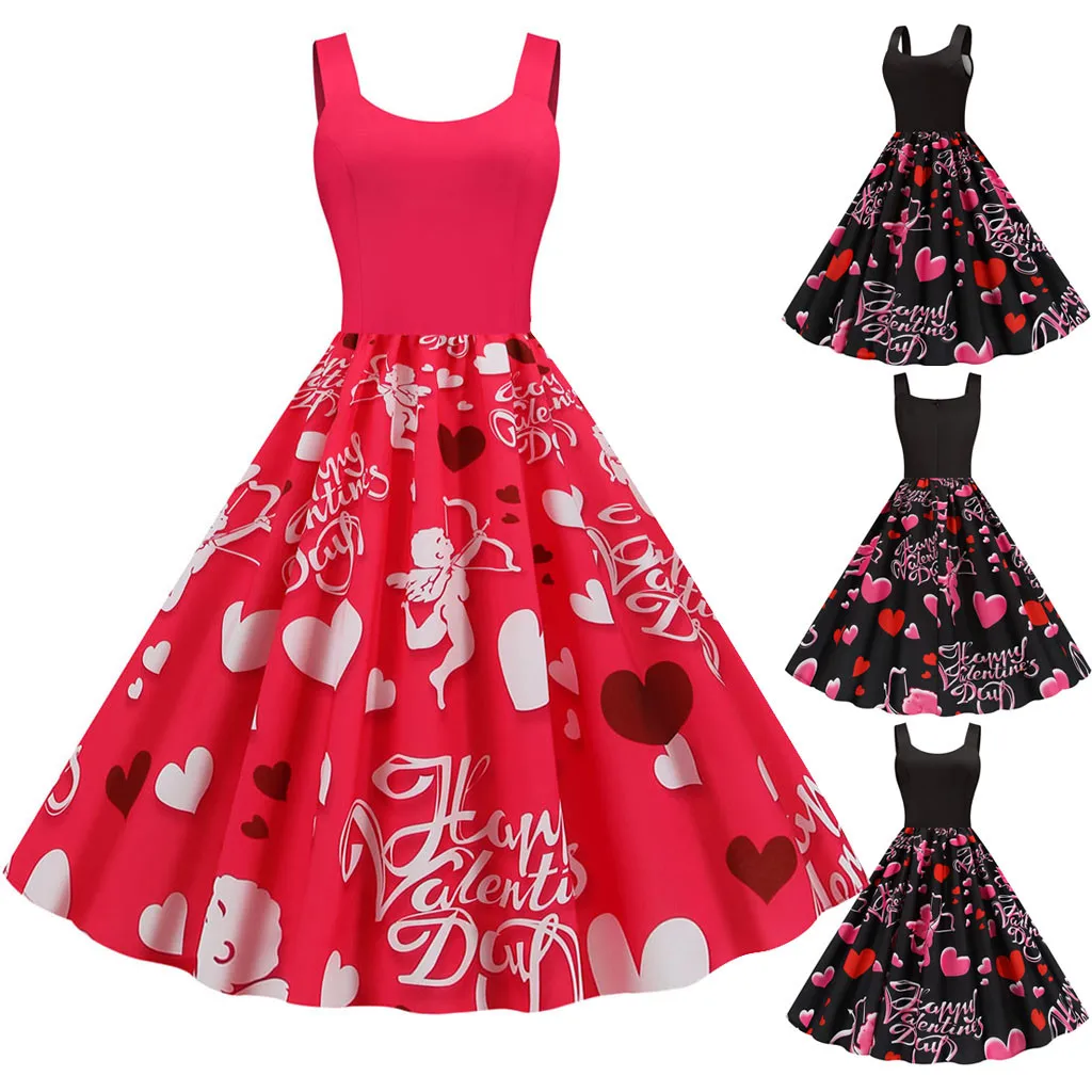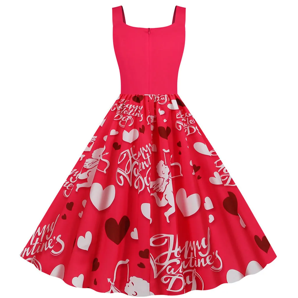 Платья для вечеринок на День святого Валентина с принтом в виде сердца Купидона, женское вечернее сексуальное платье миди без рукавов в стиле рокабилли, винтажное летнее женское платье