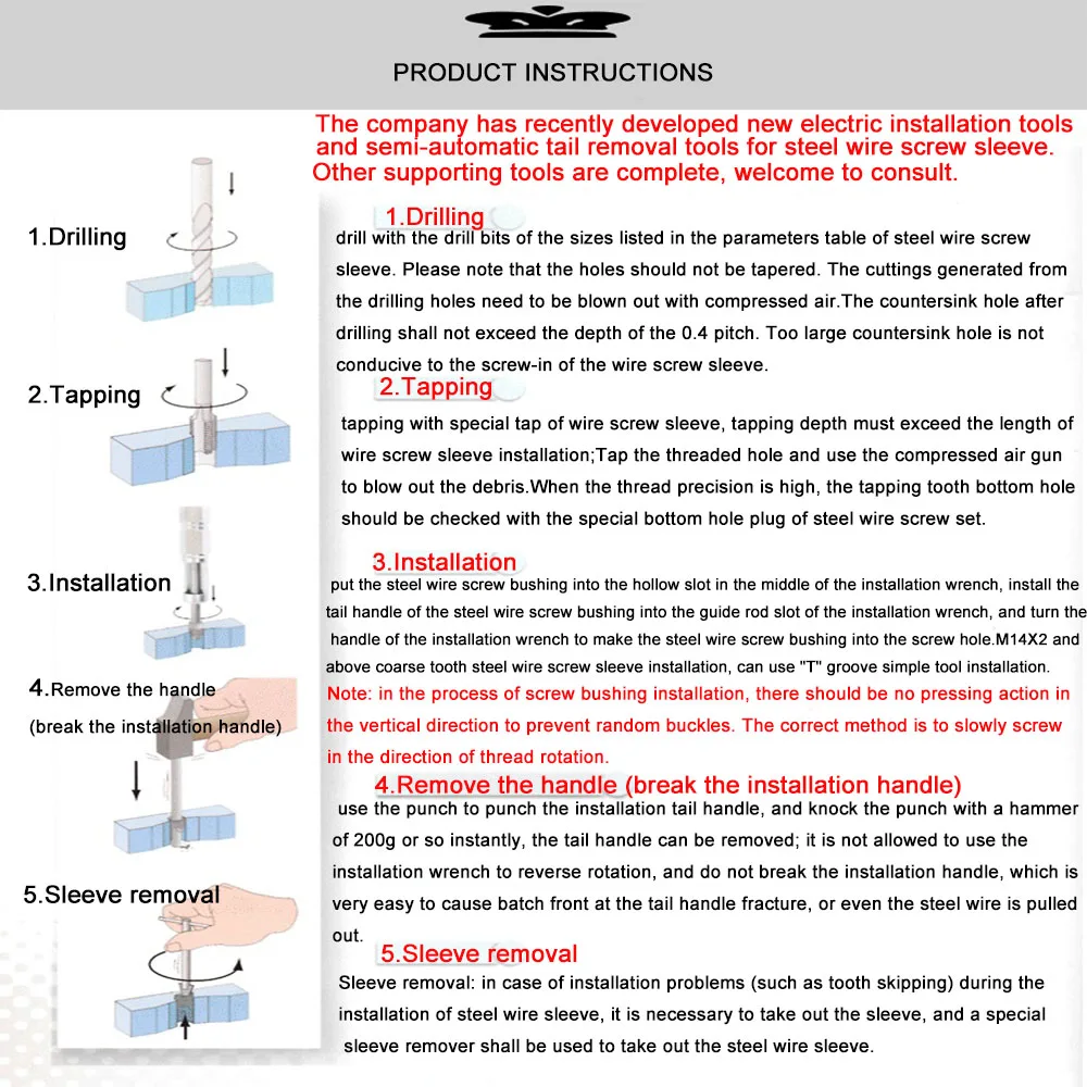 Необходимо сотрудничать с установочными инструментами, 1. Сверление 2. Нарезание резьбы 3. Установка 4. Снимите ручку (сломайте установочную ручку) 5. Удаление втулки