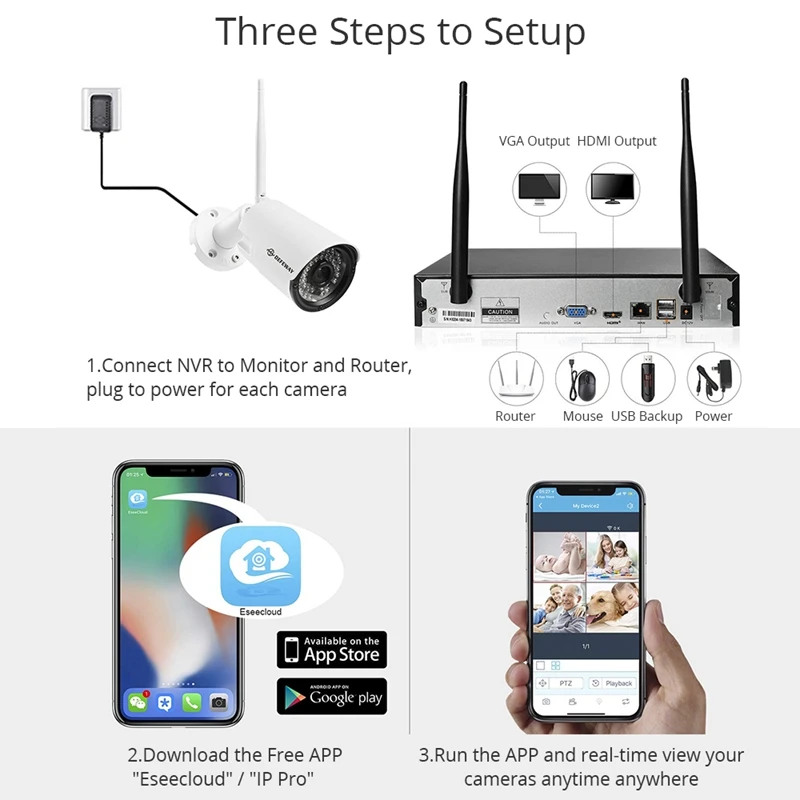 Беспроводная сеть H265 +, 8 каналов, 1080P, NVR, 8 шт., ip-камера 1080P ② Встроенный высокопроизводительный и стабильный модуль беспроводной маршрутизации Wi-Fi, 150 Мбит/с Автоматическое Сопряжение Wi-Fi с сетью ② Предварительный просмотр видео, воспроизведение, резервная копия ◆ Доступ (простой мастер настройки, меню common functiones, легко смотреть) Поддержка Android / Apple phone (или tablet), удаленного доступа и управления (LAN и Интернет) Поддержка ПК (клиента или браузера), удаленного доступа и управления (LAN и Интернет) ◆ Поддержка видео обнаружения движения ② Поддержка маскировки видео ◆ Поддержка для управление правами пользователей