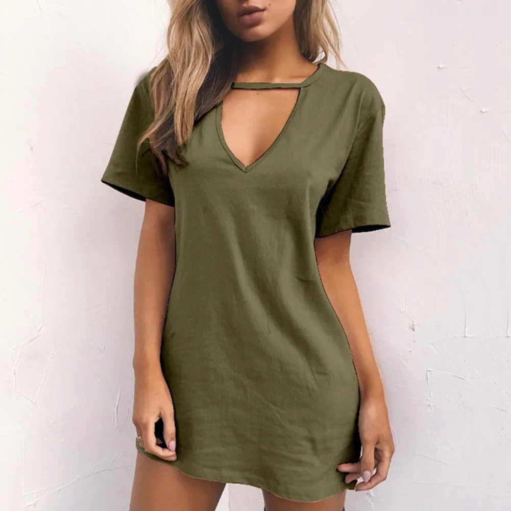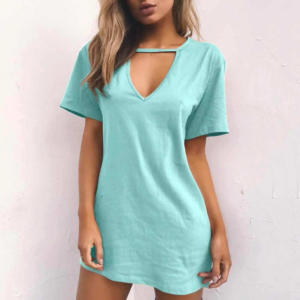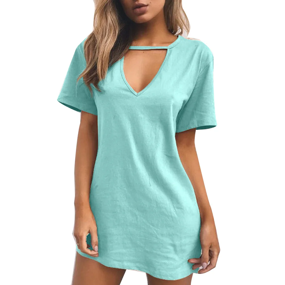 Повседневная Женская Однотонная футболка с глубоким v-образным вырезом и коротким рукавом, сексуальное свободное мини-платье