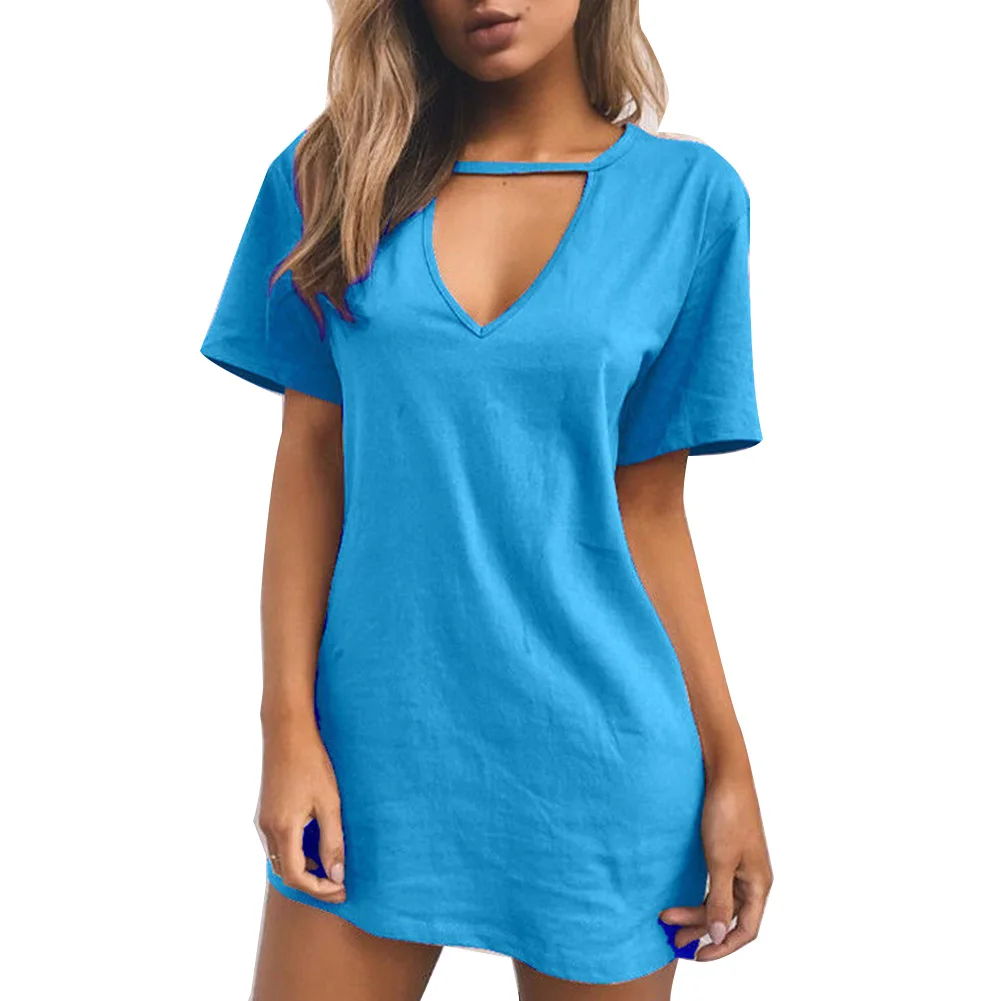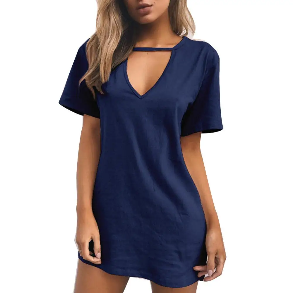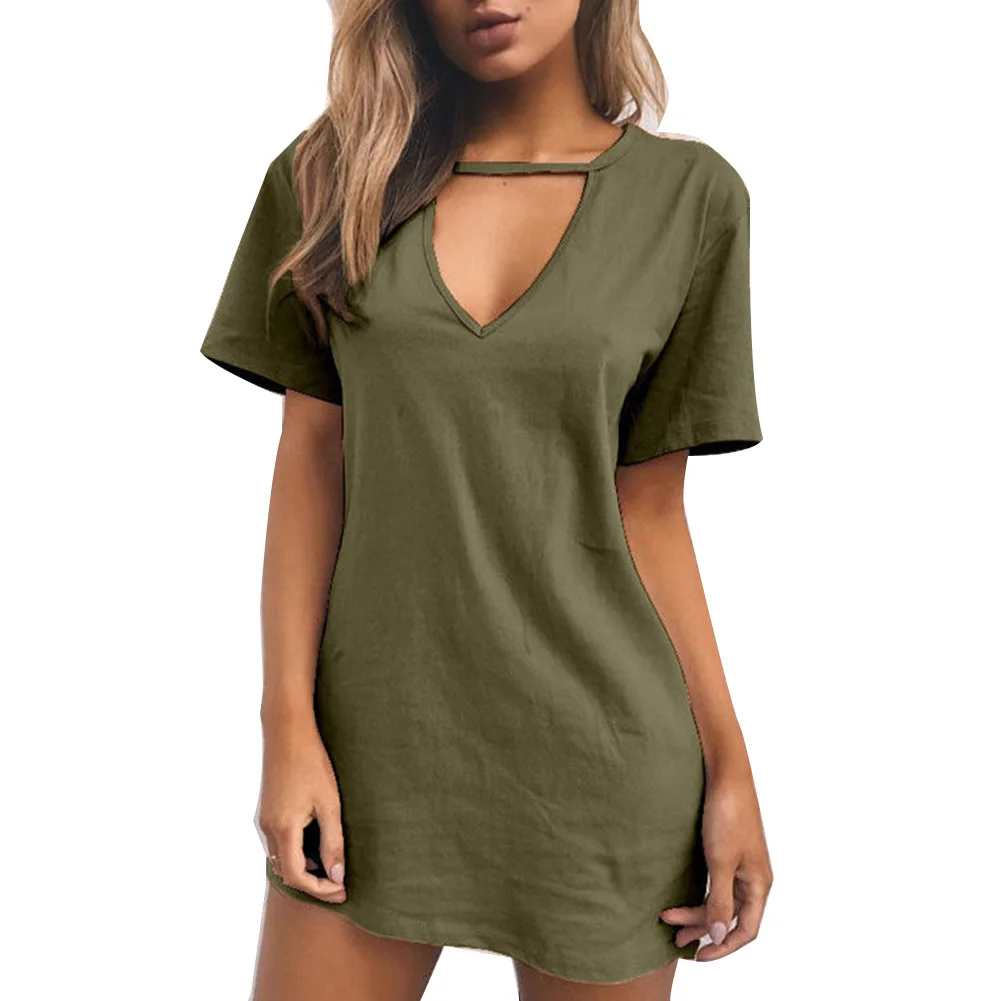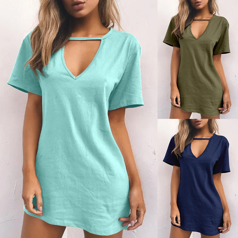 Повседневная Женская Однотонная футболка с глубоким v-образным вырезом и коротким рукавом, сексуальное свободное мини-платье