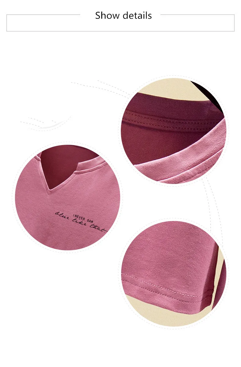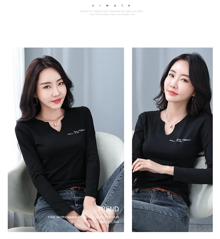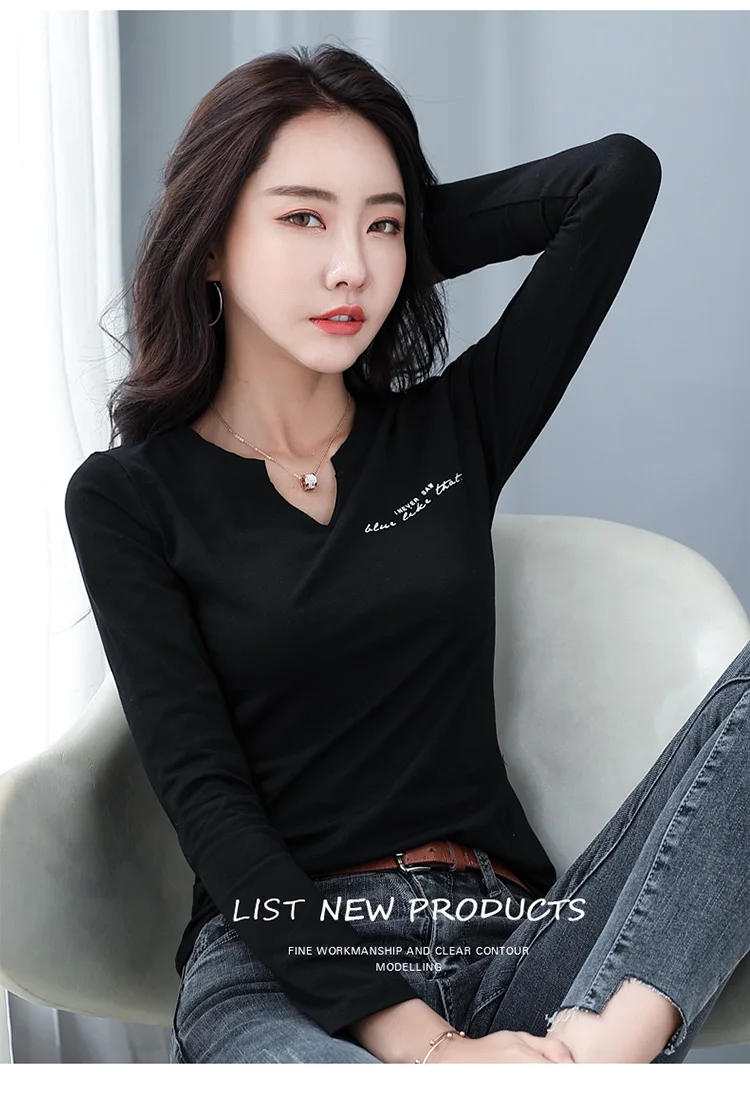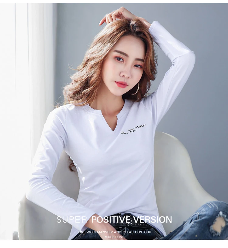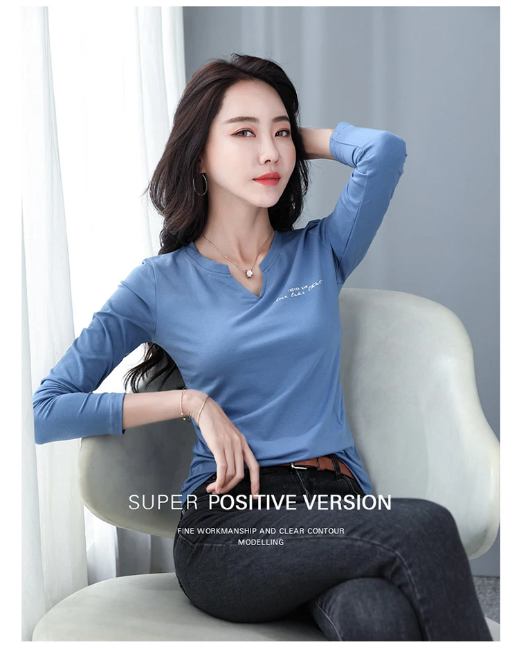 Футболка женская из 2021 хлопка с V-образным вырезом и длинным рукавом