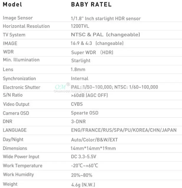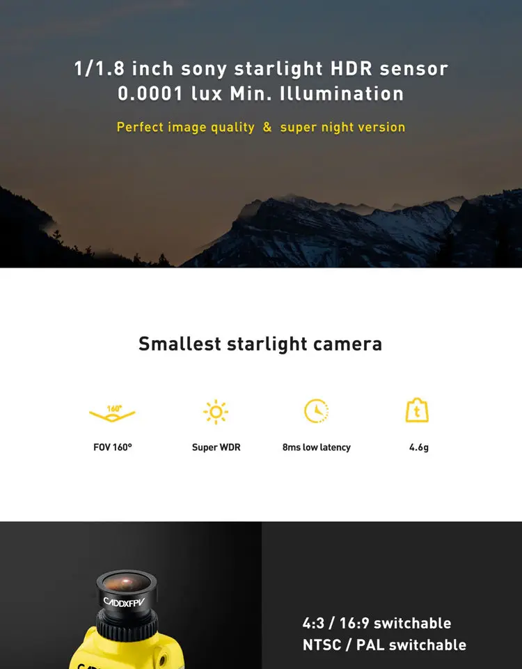Миниатюрная камера CADDX/Snail, объектив высокой производительности. 14 мм широкий мини-объем, подходит для более небольших машин. Небольшой размер, высокая производительность, 1200TVL ультра четкое качество изображения, приносит лучший опыт полета. С ультра-низкой производительностью освещения, эффект ночного видения является выдающимся. Он также имеет отличные результаты в среде подсветки в течение дня. Расширенный корпус поставляется, который может поместиться 19 мм Ширина крепления стеллажей. Сверхмощный светильник, микроразмер, высокая производительность