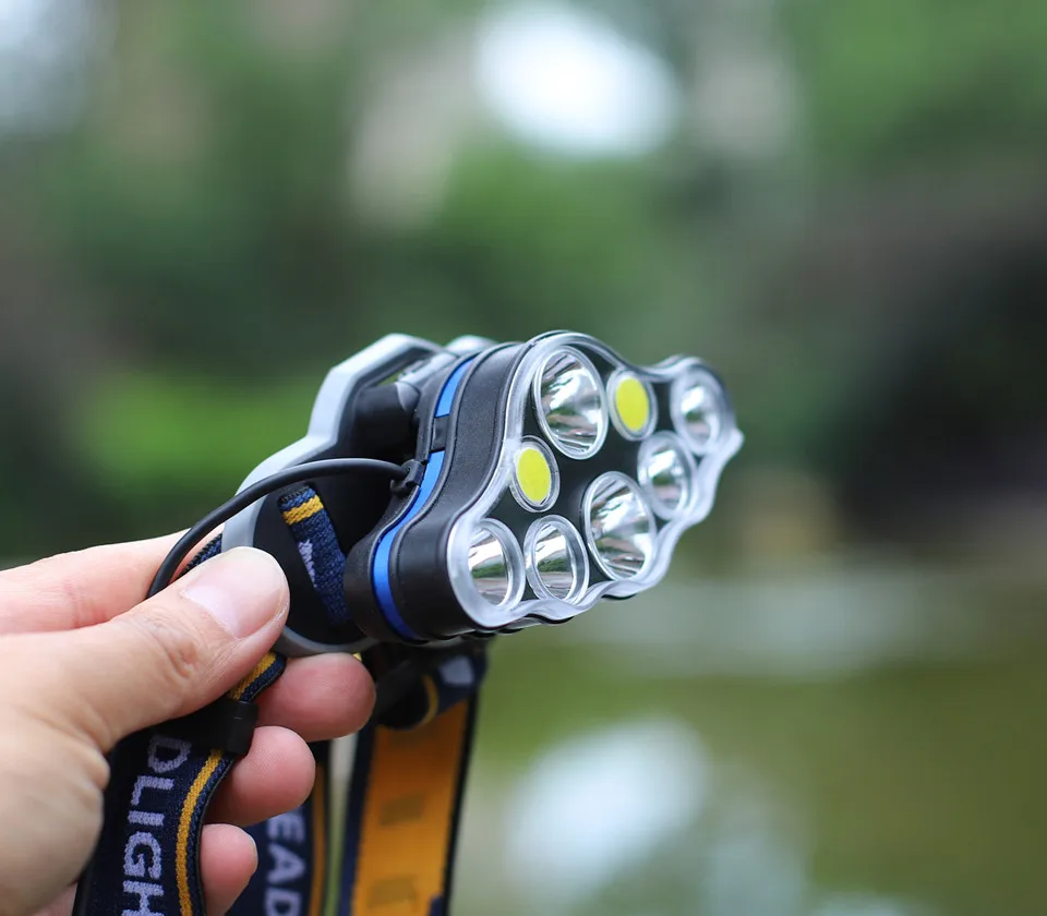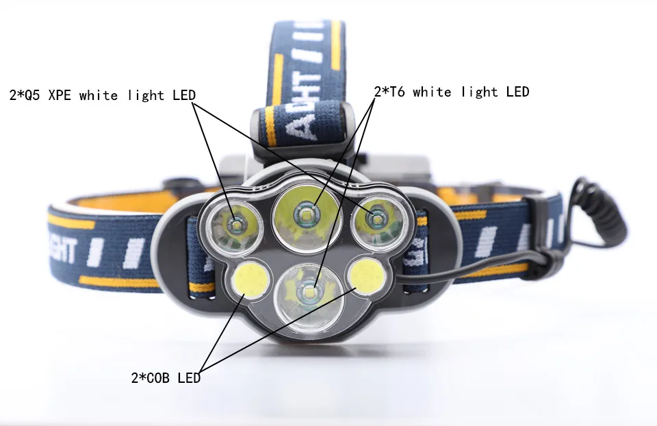 1. Батарея: 2*18650 батареи (не входят в комплект) 2. Материал: АБС-пластик 3. Модель лампы: 6 светодиодный (2 * T6 + 2 * Q5 + 2 * COB) 8 светодиодный (2 * T6 + 4 * Q5 + 2 * COB) 4. Расстояние облучения: 200-500 м 5. Регулируемые градусы: 90 градусов 6,8 режимов для нажатия переключателя: Основной светильник: 2 * T6 яркий/4 * XPE яркий/2 * T6 + 4 * XPE яркий/2 * T6 + 4 * XPE мигающий COB светильник: 2 * COB блики/2COB слабый светильник/2 * COB красный яркий/2 * COB красный светильник Особенности: Подходит для кемпинга, альпинизма, пеших прогулок, ночной рыбалки, исследования пещер и других видов активного отдыха на свежем воздухе. Водонепроницаемость: Может использоваться в дождливые дни (но не в воде).