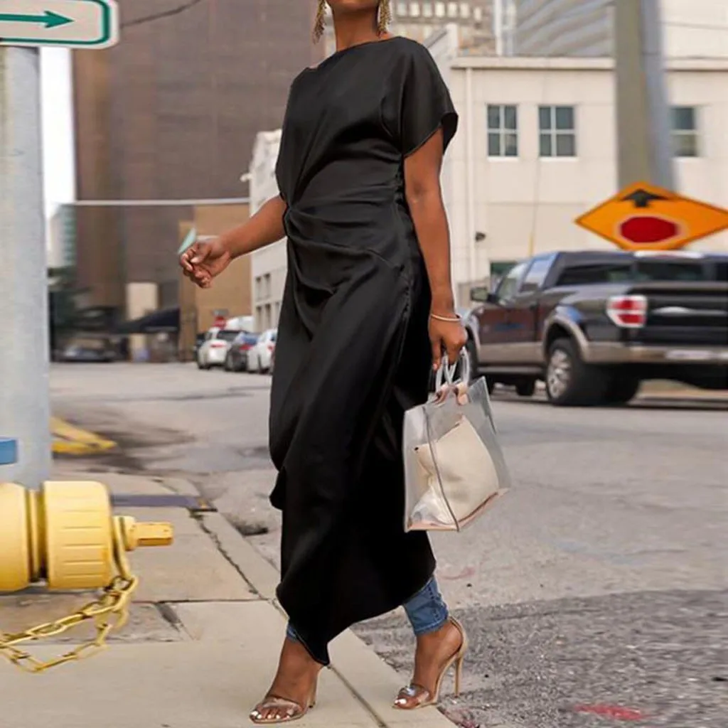 Women Casual Asymmetrical Blouse Pleated Short Sleeve Shirt Swallowtail Tops