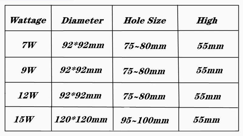 Входное напряжение: AC85-265V AC110/220V 50/60Hz Мощность: 7 Вт/9 Вт/12 Вт/15 Вт Регулировка яркости: Да Индекс цветопередачи (CRI):>Ra85 Угол луча: 45 ° Светодиодный чип: COB LED (Epistar) Световой поток: 95 ~ 110 лм/Вт Температура: от-25 до 45 ° Цветовая температура: теплый белый:(2700K-3000K); Натуральный белый:(4000K-4200K); Холодный белый:(6000K-6500K) Срок службы: 50000 ~ 80000 часов Гарантия: 3 года Материал: литье под давлением алюминий + отражающая чашка Происхождение: Гуандун (Китай)
